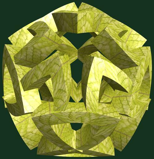 Keywords: mathematica 3d cg parametricplot3d texture torus code program algorithm プログラム コード アルゴリズム 輪環 りんかん ドーナツ どーなつ 六芒星 ろくぼうせい geometric sculpture geometricsculpture shape geometry sculpture mapping テクスチャ マッピング 模様 もよう abstract 抽象 ちゅうしょう アブストラクト design pattern デザイン パターン graphic グラフィック グラフィクス structure 意匠 構造 symmetry 対称性 たいしょうせい シンメトリー 対称 たいしょう leaf plant foliage outdoor a = 4; (* center hole size *) b = 6; (* hexa-torus *) c = -7; (* distance from the center of rotation *) d = 5; (* number of torus *) h = 1; (* height of a torus *) SetOptions[ParametricPlot3D, PlotRange -> Full, Mesh -> None, Boxed -> False, Axes -> False, PlotPoints -> 400, ImageSize -> 3000, Background -> RGBColor[{20, 50, 30}/255], PlotStyle -> Directive[Specularity[White, 30], Texture[Import["D:/tmp/71.jpg"]]], TextureCoordinateFunction -> ({#4, #5 Pi} &), Lighting -> "Neutral"]; f[v_] := TriangleWave[{-1, 1}, v/(2 Pi)]; g[v_] := TriangleWave[{-1, 1}, v/(2 Pi) + 1/4]; x = (a - g[t] - f[b s]) Cos[s]; y = (a - g[t] - f[b s]) Sin[s]; z = (a - f[t] - h f[b s]) + c; rm = Table[{x, y, z}.RotationMatrix[2 i Pi/d, {1, 1, 0}], {i, d}]; ParametricPlot3D[rm, {t, 0, 2 Pi}, {s, 0, Pi}] (*--- The Texture *) a = 4; (* center hole size *) b = 6; (* hexa-torus *) c = -7; (* distance from the center of rotation *) d = 5; (* number of torus *) h = 1; (* height of a torus *) SetOptions[ParametricPlot3D, PlotRange -> Full, Mesh -> None, Boxed -> False, Axes -> False, PlotPoints -> 400, ImageSize -> 3000, Background -> RGBColor[{20, 50, 30}/255], PlotStyle -> Directive[Specularity[White, 30], Texture[Import["D:/tmp/71.jpg"]]], TextureCoordinateFunction -> ({#4, #5 Pi} &), Lighting -> "Neutral"]; f[v_] := TriangleWave[{-1, 1}, v/(2 Pi)]; g[v_] := TriangleWave[{-1, 1}, v/(2 Pi) + 1/4]; x = (a - g[t] - f[b s]) Cos[s]; y = (a - g[t] - f[b s]) Sin[s]; z = (a - f[t] - h f[b s]) + c; rm = Table[{x, y, z}.RotationMatrix[2 i Pi/d, {1, 1, 0}], {i, d}]; ParametricPlot3D[rm, {t, 0, 2 Pi}, {s, 0, Pi}] (*--- The Texture *) |