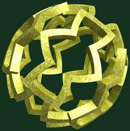 | Keywords: mathematica 3d cg parametricplot3d texture torus code program algorithm プログラム コード アルゴリズム 輪環 りんかん ドーナツ どーなつ 八芒星 はちぼうせい geometric sculpture geometricsculpture shape geometry sculpture mapping テクスチャ マッピング 模様 もよう abstract 抽象 ちゅうしょう アブストラクト design pattern デザイン パターン graphic グラフィック グラフィクス structure 意匠 構造 symmetry 対称性 たいしょうせい シンメトリー 対称 たいしょう ancient a = 8; (* center hole size *) b = 8; (* octa-torus *) c = -13; (* distance from the center of rotation *) d = 5; (* number of torus *) h = 1; (* height of a torus *) SetOptions[ParametricPlot3D, PlotRange -> Full, Mesh -> None, Boxed -> False, Axes -> False, PlotPoints -> 400, ImageSize -> 3000, Background -> RGBColor[{20, 50, 30}/255], PlotStyle -> Directive[Specularity[White, 30], Texture[Import["D:/tmp/71.jpg"]]], TextureCoordinateFunction -> ({#4, #5 Pi} &), Lighting -> "Neutral"]; f[v_] := TriangleWave[{-1, 1}, v/(2 Pi)]; g[v_] := TriangleWave[{-1, 1}, v/(2 Pi) + 1/4]; x = (a - g[t] - f[b s]) Cos[s + Pi/(2 b)]; y = (a - g[t] - f[b s]) Sin[s + Pi/(2 b)]; z = (a - f[t] - h f[b s]) + c; rm = Table[{x, y, z}.RotationMatrix[2 i Pi/d, {1, 1, 0}], {i, d}]; ParametricPlot3D[rm, {t, 0, 2 Pi}, {s, 0, Pi}] (*--- The Texture *) a = 8; (* center hole size *) b = 8; (* octa-torus *) c = -13; (* distance from the center of rotation *) d = 5; (* number of torus *) h = 1; (* height of a torus *) SetOptions[ParametricPlot3D, PlotRange -> Full, Mesh -> None, Boxed -> False, Axes -> False, PlotPoints -> 400, ImageSize -> 3000, Background -> RGBColor[{20, 50, 30}/255], PlotStyle -> Directive[Specularity[White, 30], Texture[Import["D:/tmp/71.jpg"]]], TextureCoordinateFunction -> ({#4, #5 Pi} &), Lighting -> "Neutral"]; f[v_] := TriangleWave[{-1, 1}, v/(2 Pi)]; g[v_] := TriangleWave[{-1, 1}, v/(2 Pi) + 1/4]; x = (a - g[t] - f[b s]) Cos[s + Pi/(2 b)]; y = (a - g[t] - f[b s]) Sin[s + Pi/(2 b)]; z = (a - f[t] - h f[b s]) + c; rm = Table[{x, y, z}.RotationMatrix[2 i Pi/d, {1, 1, 0}], {i, d}]; ParametricPlot3D[rm, {t, 0, 2 Pi}, {s, 0, Pi}] (*--- The Texture *) |