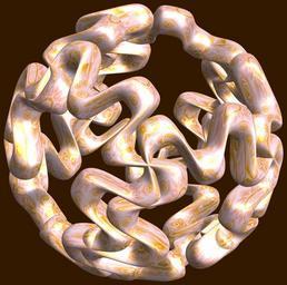 | Keywords: mathematica 3d cg parametricplot3d texture torus 輪環 りんかん ドーナツ どーなつ 八芒星 はちぼうせい 八光星 はちこうせい 八稜星 はちりょうせい code program algorithm コード プログラム アルゴリズム geometric sculpture geometricsculpture shape geometry sculpture mapping テクスチャ マッピング 模様 もよう abstract 抽象 ちゅうしょう アブストラクト design pattern デザイン パターン graphic グラフィック グラフィクス structure 意匠 構造 symmetry 対称性 たいしょうせい シンメトリー 対称 たいしょう algorithm コード black background food indoor a = 6; (* center hole size of a torus *) b = 8; (* octa-torus *) c = -12; (* distance from the center of rotation *) d = 5; (* number of torus *) h = 1; (* height of a torus *) SetOptions[ParametricPlot3D, PlotRange -> Full, Mesh -> None, Boxed -> False, Axes -> False, PlotPoints -> 400, ImageSize -> 3000, Background -> Darker[Orange, 0.8], PlotStyle -> Directive[Specularity[White, 30], Texture[Import["D:/tmp/861.jpg"]]], TextureCoordinateFunction -> ({#4, #5 2 Pi} &), Lighting -> "Neutral"]; f[v_] := Sin[2 Sin[Sin[Sin[v]]]]; x = (a - Cos[t] - f[b s]) Cos[s + Pi/b]; y = (a - Cos[t] - f[b s]) Sin[s + Pi/b]; z = (a - Sin[t] - h f[b s]) + c; rm = Table[{x, y, z}.RotationMatrix[2 i Pi/d, {1, 1, 0}], {i, d}]; ParametricPlot3D[rm, {t, 0, 2 Pi}, {s, 0, 2 Pi}] (*--- The Texture *) a = 6; (* center hole size of a torus *) b = 8; (* octa-torus *) c = -12; (* distance from the center of rotation *) d = 5; (* number of torus *) h = 1; (* height of a torus *) SetOptions[ParametricPlot3D, PlotRange -> Full, Mesh -> None, Boxed -> False, Axes -> False, PlotPoints -> 400, ImageSize -> 3000, Background -> Darker[Orange, 0.8], PlotStyle -> Directive[Specularity[White, 30], Texture[Import["D:/tmp/861.jpg"]]], TextureCoordinateFunction -> ({#4, #5 2 Pi} &), Lighting -> "Neutral"]; f[v_] := Sin[2 Sin[Sin[Sin[v]]]]; x = (a - Cos[t] - f[b s]) Cos[s + Pi/b]; y = (a - Cos[t] - f[b s]) Sin[s + Pi/b]; z = (a - Sin[t] - h f[b s]) + c; rm = Table[{x, y, z}.RotationMatrix[2 i Pi/d, {1, 1, 0}], {i, d}]; ParametricPlot3D[rm, {t, 0, 2 Pi}, {s, 0, 2 Pi}] (*--- The Texture *) |
