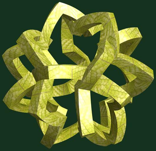 Keywords: mathematica 3d cg parametricplot3d texture torus code program algorithm プログラム コード アルゴリズム 輪環 りんかん ドーナツ どーなつ 五芒星 ごぼうせい geometric sculpture geometricsculpture shape geometry sculpture mapping テクスチャ マッピング 模様 もよう abstract 抽象 ちゅうしょう アブストラクト design pattern デザイン パターン graphic グラフィック グラフィクス structure 意匠 構造 symmetry 対称性 たいしょうせい シンメトリー 対称 たいしょう ancient black background plant leaf foliage organic pattern a = 6; (* center hole size *) b = 5; (* penta-torus *) c = -2; (* distance from the center of rotation *) d = 5; (* number of torus *) h = 1; (* height of a torus *) SetOptions[ParametricPlot3D, PlotRange -> Full, Mesh -> None, Boxed -> False, Axes -> False, PlotPoints -> 400, ImageSize -> 3000, Background -> RGBColor[{20, 50, 30}/255], PlotStyle -> Directive[Specularity[White, 30], Texture[Import["D:/tmp/71.jpg"]]], TextureCoordinateFunction -> ({#4, #5 Pi} &), Lighting -> "Neutral"]; f[v_] := TriangleWave[{-1, 1}, v/(2 Pi)]; g[v_] := TriangleWave[{-1, 1}, v/(2 Pi) + 1/4]; x = (a - g[t] - f[b s]) Cos[s]; y = (a - g[t] - f[b s]) Sin[s]; z = (a - f[t] - h f[b s]) + c; rm = Table[{x, y, z}.RotationMatrix[2 i Pi/d, {1, 1, 0}], {i, d}]; ParametricPlot3D[rm, {t, 0, 2 Pi}, {s, 0, Pi}] (*--- The Texture *) a = 6; (* center hole size *) b = 5; (* penta-torus *) c = -2; (* distance from the center of rotation *) d = 5; (* number of torus *) h = 1; (* height of a torus *) SetOptions[ParametricPlot3D, PlotRange -> Full, Mesh -> None, Boxed -> False, Axes -> False, PlotPoints -> 400, ImageSize -> 3000, Background -> RGBColor[{20, 50, 30}/255], PlotStyle -> Directive[Specularity[White, 30], Texture[Import["D:/tmp/71.jpg"]]], TextureCoordinateFunction -> ({#4, #5 Pi} &), Lighting -> "Neutral"]; f[v_] := TriangleWave[{-1, 1}, v/(2 Pi)]; g[v_] := TriangleWave[{-1, 1}, v/(2 Pi) + 1/4]; x = (a - g[t] - f[b s]) Cos[s]; y = (a - g[t] - f[b s]) Sin[s]; z = (a - f[t] - h f[b s]) + c; rm = Table[{x, y, z}.RotationMatrix[2 i Pi/d, {1, 1, 0}], {i, d}]; ParametricPlot3D[rm, {t, 0, 2 Pi}, {s, 0, Pi}] (*--- The Texture *)