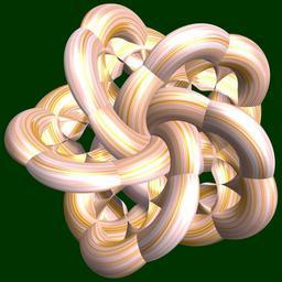 Keywords: mathematica 3d cg parametricplot3d texture torus 輪環 りんかん ドーナツ どーなつ 五芒星 ごぼうせい 五光星 ごこうせい 五稜星 ごりょうせい program プログラム code コード algorithm コード アルゴリズム pentagram geometric sculpture geometricsculpture shape geometry sculpture mapping テクスチャ マッピング 模様 もよう abstract 抽象 ちゅうしょう アブストラクト design pattern デザイン パターン graphic グラフィック グラフィクス structure 意匠 構造 symmetry 対称性 たいしょうせい シンメトリー 対称 たいしょう algorithm bright food pastel wheel black background serene SetOptions[ParametricPlot3D, PlotRange -> Full, Mesh -> None, Boxed -> False, Axes -> None, PlotPoints -> 400, ImageSize -> 3000, Background -> Darker[Green, 0.8], PlotStyle -> Directive[Specularity[White, 30], Texture[Import["D:/tmp/861.jpg"]]], TextureCoordinateFunction -> ({#4 + #5, #5/Pi} &), Lighting -> "Neutral"]; a = 3; (* center hole size of a torus *) b = 5; (* penta-torus *) c = 3; (* distance from the center of rotation *) d = 5; (* number of torus *) v = 3; w = 0.5; x = (a - Cos[w t] - Sin[b s]) Cos[v s] + c; y = Sin[w t] Sin[b s] + c; z = (a - Cos[w t] - Sin[b s]) Sin[v s] + c; rot = Table[{x, y, z}.RotationMatrix[2 i Pi/d, {1, 1, 0}], {i, d}]; ParametricPlot3D[rot, {t, 0, 2 Pi}, {s, 0, 2 Pi}] (*--- The Texture *) SetOptions[ParametricPlot3D, PlotRange -> Full, Mesh -> None, Boxed -> False, Axes -> None, PlotPoints -> 400, ImageSize -> 3000, Background -> Darker[Green, 0.8], PlotStyle -> Directive[Specularity[White, 30], Texture[Import["D:/tmp/861.jpg"]]], TextureCoordinateFunction -> ({#4 + #5, #5/Pi} &), Lighting -> "Neutral"]; a = 3; (* center hole size of a torus *) b = 5; (* penta-torus *) c = 3; (* distance from the center of rotation *) d = 5; (* number of torus *) v = 3; w = 0.5; x = (a - Cos[w t] - Sin[b s]) Cos[v s] + c; y = Sin[w t] Sin[b s] + c; z = (a - Cos[w t] - Sin[b s]) Sin[v s] + c; rot = Table[{x, y, z}.RotationMatrix[2 i Pi/d, {1, 1, 0}], {i, d}]; ParametricPlot3D[rot, {t, 0, 2 Pi}, {s, 0, 2 Pi}] (*--- The Texture *)