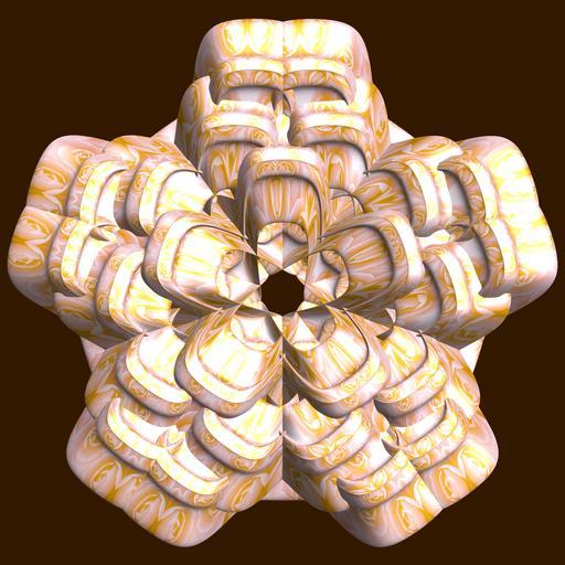| Keywords: mathematica 3d cg parametricplot3d texture torus 輪環 りんかん ドーナツ どーなつ 五芒星 ごぼうせい 五光星 ごこうせい 五稜星 ごりょうせい code program algorithm コード プログラム アルゴリズム pentagram geometric sculpture geometricsculpture shape geometry sculpture mapping テクスチャ マッピング 模様 もよう abstract 抽象 ちゅうしょう アブストラクト design pattern デザイン パターン graphic グラフィック グラフィクス structure 意匠 構造 symmetry 対称性 たいしょうせい シンメトリー 対称 たいしょう algorithm コード black background indoor a = 4; (* center hole size of a torus *) b = 5; (* penta-torus *) c = 1; (* distance from the center of rotation *) d = 5; (* number of torus *) h = 1; (* height of a torus *) SetOptions[ParametricPlot3D, PlotRange -> Full, Mesh -> None, Boxed -> False, Axes -> False, PlotPoints -> 400, ImageSize -> 3000, Background -> Darker[Orange, 0.8], PlotStyle -> Directive[Specularity[White, 30], Texture[Import["D:/tmp/861.jpg"]]], TextureCoordinateFunction -> ({#4, #5 2 Pi} &), Lighting -> "Neutral"]; f[v_] := Sin[2 Sin[Sin[Sin[v]]]]; g[v_] := Sum[Cos[(2 k - 1) v]/(2 k - 1), {k, 4}]; x = (a - g[t] - f[b s]) Cos[s + 3 Pi/(4 b)] + c; y = (a - g[t] - f[b s]) Sin[s + 3 Pi/(4 b)] + c; z = (a - Sin[t] - h f[b s]); rot = Table[{x, y, z}.RotationMatrix[2 i Pi/d, {0, 0, 1}], {i, d}]; ParametricPlot3D[rot, {t, 0, 2 Pi}, {s, 0, 2 Pi}] (*--- The Texture *) a = 4; (* center hole size of a torus *) b = 5; (* penta-torus *) c = 1; (* distance from the center of rotation *) d = 5; (* number of torus *) h = 1; (* height of a torus *) SetOptions[ParametricPlot3D, PlotRange -> Full, Mesh -> None, Boxed -> False, Axes -> False, PlotPoints -> 400, ImageSize -> 3000, Background -> Darker[Orange, 0.8], PlotStyle -> Directive[Specularity[White, 30], Texture[Import["D:/tmp/861.jpg"]]], TextureCoordinateFunction -> ({#4, #5 2 Pi} &), Lighting -> "Neutral"]; f[v_] := Sin[2 Sin[Sin[Sin[v]]]]; g[v_] := Sum[Cos[(2 k - 1) v]/(2 k - 1), {k, 4}]; x = (a - g[t] - f[b s]) Cos[s + 3 Pi/(4 b)] + c; y = (a - g[t] - f[b s]) Sin[s + 3 Pi/(4 b)] + c; z = (a - Sin[t] - h f[b s]); rot = Table[{x, y, z}.RotationMatrix[2 i Pi/d, {0, 0, 1}], {i, d}]; ParametricPlot3D[rot, {t, 0, 2 Pi}, {s, 0, 2 Pi}] (*--- The Texture *) |