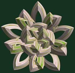 Keywords: mathematica 3d cg parametricplot3d texture torus code program algorithm プログラム コード アルゴリズム 輪環 りんかん ドーナツ どーなつ 五芒星 ごぼうせい geometric sculpture geometricsculpture shape geometry sculpture mapping テクスチャ マッピング 模様 もよう abstract 抽象 ちゅうしょう アブストラクト design pattern デザイン パターン graphic グラフィック グラフィクス structure 意匠 構造 symmetry 対称性 たいしょうせい シンメトリー 対称 たいしょう a = 3; (* center hole size *) b = 5; (* penta-torus *) c = 2; (* distance from the center of rotation *) d = 5; (* number of torus *) h = 2; (* height of a torus *) SetOptions[ParametricPlot3D, PlotRange -> Full, Mesh -> None, Boxed -> False, Axes -> False, PlotPoints -> 400, ImageSize -> 3000, Background -> RGBColor[{20, 50, 30}/255], PlotStyle -> Directive[Specularity[White, 70], Texture[Import["D:/tmp/862.jpg"]]], TextureCoordinateFunction -> ({#4 + #5, #5 / Pi} &), Lighting -> "Neutral"]; f[v_] := TriangleWave[{-1, 1}, v/(2 Pi)]; g[v_] := TriangleWave[{-1, 1}, v/(2 Pi) + 1/4]; x = (a - g[t] - f[b s]) Cos[s] + c; y = (a - g[t] - f[b s]) Sin[s] + c; z = (a - f[t] - h f[b s]); rm = Table[{x, y, z}.RotationMatrix[2 i Pi/d, {0, 0, 1}], {i, d}]; ParametricPlot3D[rm, {t, 0, 2 Pi}, {s, 0, Pi}] (*--- The Texture *) a = 3; (* center hole size *) b = 5; (* penta-torus *) c = 2; (* distance from the center of rotation *) d = 5; (* number of torus *) h = 2; (* height of a torus *) SetOptions[ParametricPlot3D, PlotRange -> Full, Mesh -> None, Boxed -> False, Axes -> False, PlotPoints -> 400, ImageSize -> 3000, Background -> RGBColor[{20, 50, 30}/255], PlotStyle -> Directive[Specularity[White, 70], Texture[Import["D:/tmp/862.jpg"]]], TextureCoordinateFunction -> ({#4 + #5, #5 / Pi} &), Lighting -> "Neutral"]; f[v_] := TriangleWave[{-1, 1}, v/(2 Pi)]; g[v_] := TriangleWave[{-1, 1}, v/(2 Pi) + 1/4]; x = (a - g[t] - f[b s]) Cos[s] + c; y = (a - g[t] - f[b s]) Sin[s] + c; z = (a - f[t] - h f[b s]); rm = Table[{x, y, z}.RotationMatrix[2 i Pi/d, {0, 0, 1}], {i, d}]; ParametricPlot3D[rm, {t, 0, 2 Pi}, {s, 0, Pi}] (*--- The Texture *)