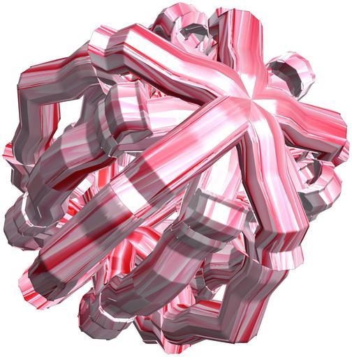 Keywords: mathematica 3d cg parametricplot3d texture torus 輪環 りんかん ドーナツ どーなつ 五芒星 ごぼうせい 五光星 五稜星 ごこうせい ごりょうせい program プログラム code コード algorithm コード アルゴリズム pentagram geometric sculpture geometricsculpture shape geometry sculpture mapping テクスチャ マッピング 模様 もよう design pattern デザイン パターン graphic グラフィック グラフィクス structure 意匠 構造 symmetry 対称性 たいしょうせい シンメトリー 対称 たいしょう algorithm white background SetOptions[ParametricPlot3D, PlotRange -> Full, Mesh -> None, Boxed -> False, Axes -> None, PlotPoints -> 300, ImageSize -> 3000, PlotStyle -> Directive[Specularity[White, 30], Texture[Import["D:/tmp/86.jpg"]]], TextureCoordinateFunction -> ({#4 + #5, #5/Pi} &), Lighting -> "Neutral"]; a = 6; (* center hole size of a torus *) b = 5; (* penta-torus *) c = 3; (* 3-partial sum of the Fourier series for Square wave *) f[v_] := Sum[TriangleWave[{-1, 1}, (2 k - 1) v]/(2 k - 1), {k, c}]; g[v_] := Sum[TriangleWave[{-1, 1}, (2 k - 1) (v + 1/4)]/(2 k - 1), {k, c}]; x = (a - f[t] - g[b s]) f[s]; y = g[t]; z = (a - f[t] - g[b s]) g[s]; rot = Table[{x, y, z}.RotationMatrix[2 i Pi /b, {1, 0, 0}], {i, b}]; ParametricPlot3D[rot, {t, 0, 1}, {s, 0, 1}] (* --- The Texture *) SetOptions[ParametricPlot3D, PlotRange -> Full, Mesh -> None, Boxed -> False, Axes -> None, PlotPoints -> 300, ImageSize -> 3000, PlotStyle -> Directive[Specularity[White, 30], Texture[Import["D:/tmp/86.jpg"]]], TextureCoordinateFunction -> ({#4 + #5, #5/Pi} &), Lighting -> "Neutral"]; a = 6; (* center hole size of a torus *) b = 5; (* penta-torus *) c = 3; (* 3-partial sum of the Fourier series for Square wave *) f[v_] := Sum[TriangleWave[{-1, 1}, (2 k - 1) v]/(2 k - 1), {k, c}]; g[v_] := Sum[TriangleWave[{-1, 1}, (2 k - 1) (v + 1/4)]/(2 k - 1), {k, c}]; x = (a - f[t] - g[b s]) f[s]; y = g[t]; z = (a - f[t] - g[b s]) g[s]; rot = Table[{x, y, z}.RotationMatrix[2 i Pi /b, {1, 0, 0}], {i, b}]; ParametricPlot3D[rot, {t, 0, 1}, {s, 0, 1}] (* --- The Texture *) |