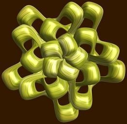 Keywords: mathematica 3d cg parametricplot3d texture torus 輪環 りんかん ドーナツ どーなつ 四芒星 しぼうせい 四光星 しこうせい 四稜星 しりょうせい code program algorithm コード プログラム アルゴリズム geometric sculpture geometricsculpture shape geometry sculpture mapping テクスチャ マッピング 模様 もよう abstract 抽象 ちゅうしょう アブストラクト design pattern デザイン パターン graphic グラフィック グラフィクス structure 意匠 構造 symmetry 対称性 たいしょうせい シンメトリー 対称 たいしょう algorithm コード indoor black background bright a = 3; (* center hole size *) b = 4; (* tetra-torus *) c = 2; (* distance from the center of rotation *) d = 5; (* number of torus *) h = 2; (* height of a torus *) SetOptions[ParametricPlot3D, PlotRange -> Full, Mesh -> None, Boxed -> False, Axes -> False, PlotPoints -> 400, ImageSize -> 3000, Background -> Darker[Orange, 0.8], PlotStyle -> Directive[Specularity[White, 30], Texture[Import["D:/tmp/71.jpg"]]], TextureCoordinateFunction -> ({#4 + #5, #5 / Pi} &), Lighting -> "Neutral"]; f[v_] := Sin[2 Sin[Sin[Sin[v]]]]; x = (a - Cos[t] - f[b s]) Cos[s] + c; y = (a - Cos[t] - f[b s]) Sin[s] + c; z = (a - Sin[t] - h f[b s]); rot = Table[{x, y, z}.RotationMatrix[2 i Pi/d, {0, 0, 1}], {i, d}]; ParametricPlot3D[rot, {t, 0, 2 Pi}, {s, 0, 2 Pi}] (*--- The Texture is this: www.flickr.com/photos/tanaka_juuyoh/5239255695/ *) a = 3; (* center hole size *) b = 4; (* tetra-torus *) c = 2; (* distance from the center of rotation *) d = 5; (* number of torus *) h = 2; (* height of a torus *) SetOptions[ParametricPlot3D, PlotRange -> Full, Mesh -> None, Boxed -> False, Axes -> False, PlotPoints -> 400, ImageSize -> 3000, Background -> Darker[Orange, 0.8], PlotStyle -> Directive[Specularity[White, 30], Texture[Import["D:/tmp/71.jpg"]]], TextureCoordinateFunction -> ({#4 + #5, #5 / Pi} &), Lighting -> "Neutral"]; f[v_] := Sin[2 Sin[Sin[Sin[v]]]]; x = (a - Cos[t] - f[b s]) Cos[s] + c; y = (a - Cos[t] - f[b s]) Sin[s] + c; z = (a - Sin[t] - h f[b s]); rot = Table[{x, y, z}.RotationMatrix[2 i Pi/d, {0, 0, 1}], {i, d}]; ParametricPlot3D[rot, {t, 0, 2 Pi}, {s, 0, 2 Pi}] (*--- The Texture is this: www.flickr.com/photos/tanaka_juuyoh/5239255695/ *) |