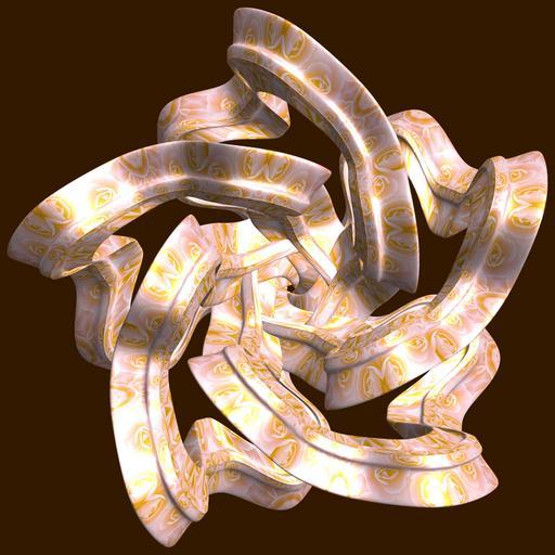 Keywords: mathematica 3d cg parametricplot3d texture torus 輪環 りんかん ドーナツ どーなつ 四芒星 しぼうせい 四光星 しこうせい 四稜星 しりょうせい code program algorithm コード プログラム アルゴリズム geometric sculpture geometricsculpture shape geometry sculpture mapping テクスチャ マッピング 模様 もよう abstract 抽象 ちゅうしょう アブストラクト design pattern デザイン パターン graphic グラフィック グラフィクス structure 意匠 構造 symmetry 対称性 たいしょうせい シンメトリー 対称 たいしょう algorithm コード black background indoor food a = 5; (* center hole size of a torus *) b = 4; (* tetra-torus *) c = 5; (* distance from the center of rotation *) d = 5; (* number of torus *) h = 1; (* height of a torus *) SetOptions[ParametricPlot3D, PlotRange -> Full, Mesh -> None, Boxed -> False, Axes -> False, PlotPoints -> 400, ImageSize -> 3000, Background -> Darker[Orange, 0.8], PlotStyle -> Directive[Specularity[White, 30], Texture[Import["D:/tmp/861.jpg"]]], TextureCoordinateFunction -> ({#4, #5 2 Pi} &), Lighting -> "Neutral"]; f[v_] := Sin[2 Sin[Sin[Sin[v]]]]; g[v_] := Sum[Cos[(2 k - 1) v]/(2 k - 1), {k, 4}]; x = (a - g[t] - f[b s]) Cos[s + 3 Pi/(4 b)] + c; y = (a - g[t] - f[b s]) Sin[s + 3 Pi/(4 b)] + 2 c; z = (a - Sin[t] - h f[b s]); rot = Table[{x, y, z}.RotationMatrix[2 i Pi/d, {1, 1, 1}], {i, d}]; ParametricPlot3D[rot, {t, 0, 2 Pi}, {s, 0, 2 Pi}] (*--- The Texture *) a = 5; (* center hole size of a torus *) b = 4; (* tetra-torus *) c = 5; (* distance from the center of rotation *) d = 5; (* number of torus *) h = 1; (* height of a torus *) SetOptions[ParametricPlot3D, PlotRange -> Full, Mesh -> None, Boxed -> False, Axes -> False, PlotPoints -> 400, ImageSize -> 3000, Background -> Darker[Orange, 0.8], PlotStyle -> Directive[Specularity[White, 30], Texture[Import["D:/tmp/861.jpg"]]], TextureCoordinateFunction -> ({#4, #5 2 Pi} &), Lighting -> "Neutral"]; f[v_] := Sin[2 Sin[Sin[Sin[v]]]]; g[v_] := Sum[Cos[(2 k - 1) v]/(2 k - 1), {k, 4}]; x = (a - g[t] - f[b s]) Cos[s + 3 Pi/(4 b)] + c; y = (a - g[t] - f[b s]) Sin[s + 3 Pi/(4 b)] + 2 c; z = (a - Sin[t] - h f[b s]); rot = Table[{x, y, z}.RotationMatrix[2 i Pi/d, {1, 1, 1}], {i, d}]; ParametricPlot3D[rot, {t, 0, 2 Pi}, {s, 0, 2 Pi}] (*--- The Texture *) |
