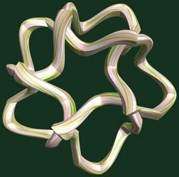 | Keywords: mathematica 3d cg parametricplot3d texture torus code program algorithm tri-torus tritorus プログラム コード アルゴリズム 輪環 りんかん ドーナツ どーなつ 三芒星 さんぼうせい geometric sculpture geometricsculpture shape geometry sculpture mapping テクスチャ マッピング 模様 もよう abstract 抽象 ちゅうしょう アブストラクト design pattern デザイン パターン graphic グラフィック グラフィクス structure 意匠 構造 symmetry 対称性 たいしょうせい シンメトリー 対称 たいしょう black background curve indoor tangle a = 6; (* center hole size *) b = 3; (* tri-torus *) c = -3; (* distance from the center of rotation *) d = 5; (* number of torus *) h = 2; (* height of a torus *) SetOptions[ParametricPlot3D, PlotRange -> Full, Mesh -> None, Boxed -> False, Axes -> False, PlotPoints -> 400, ImageSize -> 3000, Background -> RGBColor[{20, 50, 30}/255], PlotStyle -> Directive[Specularity[White, 70], Texture[Import["D:/tmp/862.jpg"]]], TextureCoordinateFunction -> ({#4 + #5, #5 / Pi} &), Lighting -> "Neutral"]; f[v_] := TriangleWave[{-1, 1}, v/(2 Pi)]; g[v_] := TriangleWave[{-1, 1}, v/(2 Pi) + 1/4]; x = (a - g[t] - f[b s]) g[s] + c; y = (a - g[t] - f[b s]) f[s] + c; z = (a - Sin[t] - h Sin[b s]); rm = Table[{x, y, z}.RotationMatrix[2 i Pi/d, {1, 1, 1}], {i, d}]; ParametricPlot3D[rm, {t, 0, 2 Pi}, {s, 0, 2 Pi}] (*--- The Texture *) a = 6; (* center hole size *) b = 3; (* tri-torus *) c = -3; (* distance from the center of rotation *) d = 5; (* number of torus *) h = 2; (* height of a torus *) SetOptions[ParametricPlot3D, PlotRange -> Full, Mesh -> None, Boxed -> False, Axes -> False, PlotPoints -> 400, ImageSize -> 3000, Background -> RGBColor[{20, 50, 30}/255], PlotStyle -> Directive[Specularity[White, 70], Texture[Import["D:/tmp/862.jpg"]]], TextureCoordinateFunction -> ({#4 + #5, #5 / Pi} &), Lighting -> "Neutral"]; f[v_] := TriangleWave[{-1, 1}, v/(2 Pi)]; g[v_] := TriangleWave[{-1, 1}, v/(2 Pi) + 1/4]; x = (a - g[t] - f[b s]) g[s] + c; y = (a - g[t] - f[b s]) f[s] + c; z = (a - Sin[t] - h Sin[b s]); rm = Table[{x, y, z}.RotationMatrix[2 i Pi/d, {1, 1, 1}], {i, d}]; ParametricPlot3D[rm, {t, 0, 2 Pi}, {s, 0, 2 Pi}] (*--- The Texture *) |