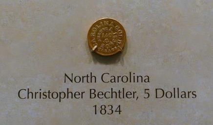 | Keywords: 5 Dollars, Christopher Bechtler, North Carolina, 1834 - National Museum of American History - DSC00213.jpg en Exhibit in the National Museum of American History Washington DC USA Photography was permitted in the museum without restriction 2015-03-27 11 31 27 own Daderot other versions cc-zero Coins in the National Museum of American History Local currencies of the United States | ||||