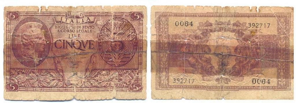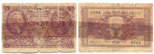 Keywords: 5 lire carta 1944.JPG Biglietto di stato a corso legale da 5 lire italiane tipo Atena elmata Fu emesso in base al decreto 20/12/1945 in tre emissioni datate 1946 1947 e 1952 own Totila2122 Lira Luogotenenziale 1944-1946 Banknotes with a face value of 5 |
