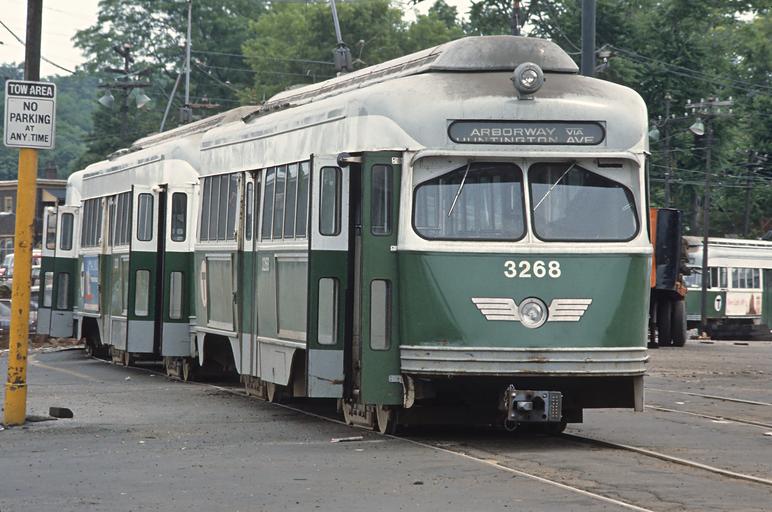 Keywords: outdoor vehicle train Photos of MBTA 3268 and 3283. MBTA 3268, ARBORWAY VIA HUNTINGTON AVE, Arborway Yard, on June 27, 1983 Photos of MBTA 3268 and 3283. MBTA 3268, ARBORWAY VIA HUNTINGTON AVE, Arborway Yard, on June 27, 1983