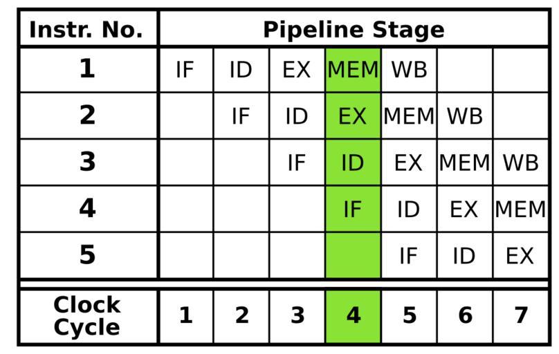 Keywords: 5 Stage Pipeline.svg en A diagram showing the stage of execution reached by five consecutive instructions in a 5-stage microprocessor At clock cycle 4 the 1st instruction is in the memory access phase the second is in the execute phase the third in the instruction decode phase the fourth in the instruction fetch phase and the fifth hasn't been fetched yet own Inductiveload 2009-01-22 Pipeline diagrams computer science SVG flow charts |