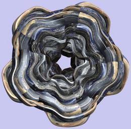 | Keywords: mathematica 3d cg parametricplot3d texture torus code program algorithm プログラム コード アルゴリズム 輪環 りんかん ドーナツ どーなつ トーラス とーらす mapping テクスチャ マッピング 模様 もよう abstract 抽象 ちゅうしょう アブストラクト design pattern デザイン パターン graphic グラフィック グラフィクス structure 意匠 構造 symmetry 対称性 たいしょうせい シンメトリー 対称 たいしょう drawing surreal painting door white background architecture a = 7; (* center hole size of a torus *) b1 = 4;(* the number of angles *) b2 = 4;(* the number of waves *) c = 1; (* distance from the center of rotation *) d = 5; (* the number of tori *) h1 = 3; (* width of a torus *) h2 = 1; (* width of a torus *) SetOptions[ParametricPlot3D, PlotRange -> Full, Mesh -> None, Boxed -> False, Axes -> None, PlotPoints -> 500, ImageSize -> 3000, Background -> RGBColor[{200, 200, 240}/255], PlotStyle -> Directive[Specularity[White, 70], Texture[Import["D:/tmp/94.jpg"]]], TextureCoordinateFunction -> ({#4, #5 Pi} &), Lighting -> "Neutral"]; f[v_] := Sin[2 Sin[Sin[Sin[v]]]]; x = (a - h1 Cos[t] + h2 f[b1 s]) Cos[s] + c; y = (a - h1 Cos[t] + h2 f[b1 s]) Sin[s] + c; z = f[b2 t]; rm = Table[{x, y, z}.RotationMatrix[2 i Pi/d, {0, 1, 2}], {i, d}]; ParametricPlot3D[rm, {t, 0, 2 Pi}, {s, 0, 2 Pi}] (*--- The Texture *) a = 7; (* center hole size of a torus *) b1 = 4;(* the number of angles *) b2 = 4;(* the number of waves *) c = 1; (* distance from the center of rotation *) d = 5; (* the number of tori *) h1 = 3; (* width of a torus *) h2 = 1; (* width of a torus *) SetOptions[ParametricPlot3D, PlotRange -> Full, Mesh -> None, Boxed -> False, Axes -> None, PlotPoints -> 500, ImageSize -> 3000, Background -> RGBColor[{200, 200, 240}/255], PlotStyle -> Directive[Specularity[White, 70], Texture[Import["D:/tmp/94.jpg"]]], TextureCoordinateFunction -> ({#4, #5 Pi} &), Lighting -> "Neutral"]; f[v_] := Sin[2 Sin[Sin[Sin[v]]]]; x = (a - h1 Cos[t] + h2 f[b1 s]) Cos[s] + c; y = (a - h1 Cos[t] + h2 f[b1 s]) Sin[s] + c; z = f[b2 t]; rm = Table[{x, y, z}.RotationMatrix[2 i Pi/d, {0, 1, 2}], {i, d}]; ParametricPlot3D[rm, {t, 0, 2 Pi}, {s, 0, 2 Pi}] (*--- The Texture *) |