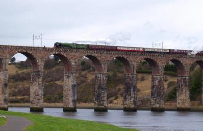 Keywords: 60163 Tornado 7 March 2009 Berwick.jpg Brand new steam locomotive 60163 Tornado crosses the Royal Border Bridge railway viaduct in Berwick-upon-Tweed travelling south at the head of The North Briton charter train from Edinburgh to York This was the first time Tornado had passed over the viaduct in the southbound direction having crossed for the first time in northbound a week earlier hauling The Auld Reekie Express from York to Edinburgh Tornado is brand new Peppercorn A1 class locomotive completed in 2008 The Peppercorn A1 was the last type of express passenger steam locomotive that was used on this route on the East Coast Main Line from Scotland to London None of the original 49 survived the scrapyard in the change to diesel and later electric traction Tornado is coasting at this point the steam above the locomotive is actually coming from the boiler safety valves and not the chimney creating a false impression of a steam exhaust Taken at 15 12 GMT from the south bank of the River Tweed east of the bridge Tornado was approximately 15 minutes early for arrival in Berwick and proceeded to Tweedmouth sidings on the other side of the bridge to take on water own 2009-03-07 User Ultra7 LNER Peppercorn Class A1 60163 Tornado on the British mainline LNER Peppercorn Class A1 60163 Tornado in LNER Apple Green livery LNER Peppercorn Class A1 60163 Tornado in 2009 LNER Peppercorn Class A1 60163 Tornado all files LNER Peppercorn Class A1 60163 Tornado in colour photographs Royal Border Bridge Overhead lines in the United Kingdom |
