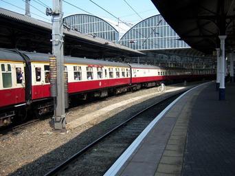 Keywords: 60163 Tornado Private Charter Cathedrals Express Top Gear Race 25 April 2009 Newcastle pic 5.jpg Brand new steam locomotive 60163 Tornado hauls a charter train from London Kings Cross to Edinburgh Waverley on 25 April 2009 The private trip was filmed by the BBC for a Top Gear Race with James May a k a Captain Slow in a vintage Jaguar and Richard hammond on a classic motorbike racing Jeremy clarkson on the train but with the car and bike only allowed to use A roads Tornado was booked to leave London at 07 25 BST and arrive in Edinburgh at 15 27 BST http //www uksteam info/tours/t09/t0425c htm Booked times The train carried the headboard for a Cathedrals Express journey and barring the maroon support coach at the front was formed from a uniform rake of nine Royal Scot blood and custard coaches The train is pictured here passing through Newcastle Central Station on time at 13 09 BST GMT+1 but is believed to have arrived early in Edinburgh own 2009-04-25 User Ultra7 Top Gear Riviera Trains Royal Scot rake British Rail Mk1 coaches LNER Peppercorn Class A1 60163 Tornado rolling stock Newcastle railway station inner trainshed and platforms 2009 Trains at Newcastle railway station April 2009 in Newcastle upon Tyne |