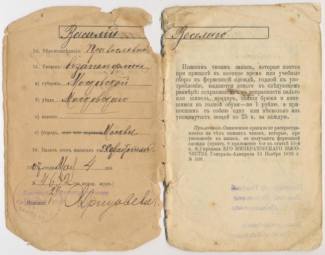 Keywords: Ополченский билет № 6307 (1901 г.) Василия Веселаго (с. 6—7).jpg ru Ополченский билет 6307 1901 г Василия Веселаго с 6 7 1901 Chelovechek с о игинала из собственного а хива Chelovechek from original in own archive Chelovechek de l'original en propre archive ru е указывается en Not credited PD-RusEmpire Uploaded with UploadWizard Vasily Veselago militia ticket |