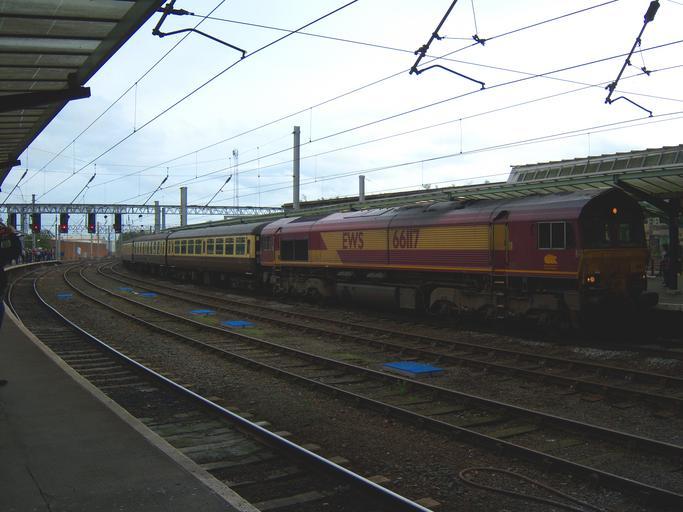 | Keywords: 66117 EWS Class 66 diesel locomotive Carlisle 10 Oct 2009.jpg A w British Rail Class 66 Class 66 diesel locomotive No 66117 in English Welsh and Scottish Railway EWS colours hauls the coaching stock of the Cumbrian Mountain Tornado railtour into Platform 3 of Carlisle railway station from the sidings in readiness for No 60163 Tornado to couple to the other end and haul it on the return leg south having brought it north earlier in the day own 2009-10-10 Ultra7 Trains at Carlisle railway station 066117 British Rail Class 66/0s of DB Schenker Rail UK 66117 British Rail Class 66s in English Welsh and Scottish Railway livery 66117 British Rail Class 66s on the West Coast Main Line 66117 2009 in Carlisle 2009-10-10 00 00 00 October 2009 in Cumbria 2009-10-10 00 00 00 Charter trains of the United Kingdom Photographs taken on 2009-10-10 |