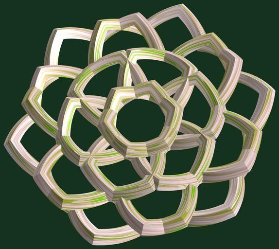 Keywords: mathematica 3d cg parametricplot3d texture torus code program algorithm プログラム コード アルゴリズム 輪環 りんかん ドーナツ どーなつ 六芒星 ろくぼうせい geometric sculpture geometricsculpture shape geometry sculpture mapping テクスチャ マッピング 模様 もよう abstract 抽象 ちゅうしょう アブストラクト design pattern デザイン パターン graphic グラフィック グラフィクス structure 意匠 構造 symmetry 対称性 たいしょうせい シンメトリー 対称 たいしょう tangle a = 9; (* center hole size *) b = 6; (* hexa-torus *) c = 4; (* distance from the center of rotation *) d = 6; (* number of torus *) h = 1; (* height of a torus *) SetOptions[ParametricPlot3D, PlotRange -> Full, Mesh -> None, Boxed -> False, Axes -> False, PlotPoints -> 400, ImageSize -> 3000, Background -> RGBColor[{20, 50, 30}/255], PlotStyle -> Directive[Specularity[White, 40], Texture[Import["D:/tmp/862.jpg"]]], TextureCoordinateFunction -> ({#4 + #5, #5 / Pi} &), Lighting -> "Neutral"]; f[v_] := TriangleWave[{-1, 1}, v/(2 Pi)]; g[v_] := TriangleWave[{-1, 1}, v/(2 Pi) + 1/4]; x = (a - g[t] - f[b s]) Cos[s] + c; y = (a - g[t] - f[b s]) Sin[s] + c; z = (a - f[t] - h f[b s]); rm = Table[{x, y, z}.RotationMatrix[2 i Pi/d, {0, 0, 1}], {i, d}]; ParametricPlot3D[rm, {t, 0, 2 Pi}, {s, 0, Pi}] (*--- The Texture *) a = 9; (* center hole size *) b = 6; (* hexa-torus *) c = 4; (* distance from the center of rotation *) d = 6; (* number of torus *) h = 1; (* height of a torus *) SetOptions[ParametricPlot3D, PlotRange -> Full, Mesh -> None, Boxed -> False, Axes -> False, PlotPoints -> 400, ImageSize -> 3000, Background -> RGBColor[{20, 50, 30}/255], PlotStyle -> Directive[Specularity[White, 40], Texture[Import["D:/tmp/862.jpg"]]], TextureCoordinateFunction -> ({#4 + #5, #5 / Pi} &), Lighting -> "Neutral"]; f[v_] := TriangleWave[{-1, 1}, v/(2 Pi)]; g[v_] := TriangleWave[{-1, 1}, v/(2 Pi) + 1/4]; x = (a - g[t] - f[b s]) Cos[s] + c; y = (a - g[t] - f[b s]) Sin[s] + c; z = (a - f[t] - h f[b s]); rm = Table[{x, y, z}.RotationMatrix[2 i Pi/d, {0, 0, 1}], {i, d}]; ParametricPlot3D[rm, {t, 0, 2 Pi}, {s, 0, Pi}] (*--- The Texture *) |