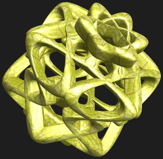 Keywords: mathematica 3d cg parametricplot3d texture torus 輪環 りんかん ドーナツ どーなつ 六芒星 ろくぼうせい 六光星 ろくこうせい 六稜星 ろくりょうせい code program algorithm コード プログラム アルゴリズム hexagram geometric sculpture geometricsculpture shape geometry sculpture mapping テクスチャ マッピング 模様 もよう abstract 抽象 ちゅうしょう アブストラクト design pattern デザイン パターン graphic グラフィック グラフィクス structure 意匠 構造 symmetry 対称性 たいしょうせい シンメトリー 対称 たいしょう algorithm コード black background indoor plant foliage organic pattern ancient a = 8; (* center hole size of a torus *) b = 6; (* hexa-torus *) c = -7; (* distance from the center of rotation *) d = 6; (* number of torus *) h = 3; (* height of a torus *) SetOptions[ParametricPlot3D, PlotRange -> Full, Mesh -> None, Boxed -> False, Axes -> False, PlotPoints -> 400, ImageSize -> 3000, Background -> RGBColor[{30, 30, 30}/255], PlotStyle -> Directive[Specularity[White, 30], Texture[Import["D:/tmp/71.jpg"]]], TextureCoordinateFunction -> ({#4, #5 b Pi} &), Lighting -> "Neutral"]; f[v_] := Sin[2 Sin[Sin[Sin[v]]]]; x = (a - Cos[t] - Sin[b s]) Cos[s + Pi/(2 b)]; y = (a - Cos[t] - Sin[b s]) Sin[s + Pi/(2 b)]; z = (a - f[t] - h Sin[b s]) + c; rm = Table[{x, y, z}.RotationMatrix[2 i Pi/d, {1, 0, 0}], {i, d}]; ParametricPlot3D[rm, {t, 0, 2 Pi}, {s, 0, 2 Pi}] (*--- The Texture *) a = 8; (* center hole size of a torus *) b = 6; (* hexa-torus *) c = -7; (* distance from the center of rotation *) d = 6; (* number of torus *) h = 3; (* height of a torus *) SetOptions[ParametricPlot3D, PlotRange -> Full, Mesh -> None, Boxed -> False, Axes -> False, PlotPoints -> 400, ImageSize -> 3000, Background -> RGBColor[{30, 30, 30}/255], PlotStyle -> Directive[Specularity[White, 30], Texture[Import["D:/tmp/71.jpg"]]], TextureCoordinateFunction -> ({#4, #5 b Pi} &), Lighting -> "Neutral"]; f[v_] := Sin[2 Sin[Sin[Sin[v]]]]; x = (a - Cos[t] - Sin[b s]) Cos[s + Pi/(2 b)]; y = (a - Cos[t] - Sin[b s]) Sin[s + Pi/(2 b)]; z = (a - f[t] - h Sin[b s]) + c; rm = Table[{x, y, z}.RotationMatrix[2 i Pi/d, {1, 0, 0}], {i, d}]; ParametricPlot3D[rm, {t, 0, 2 Pi}, {s, 0, 2 Pi}] (*--- The Texture *) |