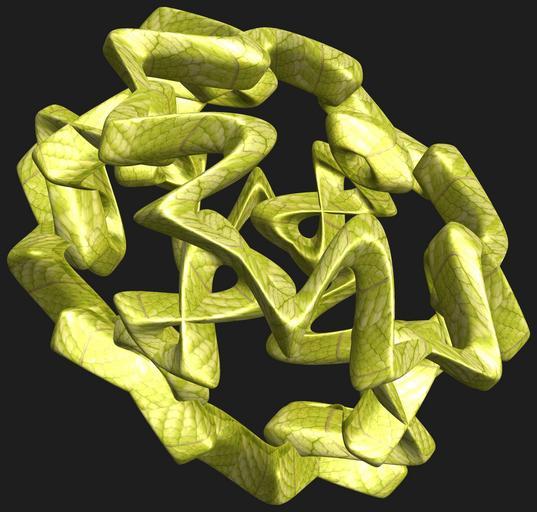 | Keywords: mathematica 3d cg parametricplot3d texture torus 輪環 りんかん ドーナツ どーなつ 六芒星 ろくぼうせい 六光星 ろくこうせい 六稜星 ろくりょうせい code program algorithm コード プログラム アルゴリズム hexagram geometric sculpture geometricsculpture shape geometry sculpture mapping テクスチャ マッピング 模様 もよう abstract 抽象 ちゅうしょう アブストラクト design pattern デザイン パターン graphic グラフィック グラフィクス structure 意匠 構造 symmetry 対称性 たいしょうせい シンメトリー 対称 たいしょう algorithm コード black background a = 5; (* center hole size of a torus *) b = 6; (* hexa-torus *) c = -13; (* distance from the center of rotation *) d = 6; (* number of torus *) h = 2; (* height of a torus *) SetOptions[ParametricPlot3D, PlotRange -> Full, Mesh -> None, Boxed -> False, Axes -> False, PlotPoints -> 400, ImageSize -> 3000, Background -> RGBColor[{30, 30, 30}/255], PlotStyle -> Directive[Specularity[White, 30], Texture[Import["D:/tmp/71.jpg"]]], TextureCoordinateFunction -> ({#4, #5 b Pi} &), Lighting -> "Neutral"]; f[v_] := Sin[2 Sin[Sin[Sin[v]]]]; x = (a - Cos[t] - Sin[b s]) Cos[s + Pi/(2 b)]; y = (a - Cos[t] - Sin[b s]) Sin[s + Pi/(2 b)]; z = (a - f[t] - h Sin[b s]) + c; rm = Table[{x, y, z}.RotationMatrix[2 i Pi/d, {1, 0, 0}], {i, d}]; ParametricPlot3D[rm, {t, 0, 2 Pi}, {s, 0, 2 Pi}] (*--- The Texture *) a = 5; (* center hole size of a torus *) b = 6; (* hexa-torus *) c = -13; (* distance from the center of rotation *) d = 6; (* number of torus *) h = 2; (* height of a torus *) SetOptions[ParametricPlot3D, PlotRange -> Full, Mesh -> None, Boxed -> False, Axes -> False, PlotPoints -> 400, ImageSize -> 3000, Background -> RGBColor[{30, 30, 30}/255], PlotStyle -> Directive[Specularity[White, 30], Texture[Import["D:/tmp/71.jpg"]]], TextureCoordinateFunction -> ({#4, #5 b Pi} &), Lighting -> "Neutral"]; f[v_] := Sin[2 Sin[Sin[Sin[v]]]]; x = (a - Cos[t] - Sin[b s]) Cos[s + Pi/(2 b)]; y = (a - Cos[t] - Sin[b s]) Sin[s + Pi/(2 b)]; z = (a - f[t] - h Sin[b s]) + c; rm = Table[{x, y, z}.RotationMatrix[2 i Pi/d, {1, 0, 0}], {i, d}]; ParametricPlot3D[rm, {t, 0, 2 Pi}, {s, 0, 2 Pi}] (*--- The Texture *) |