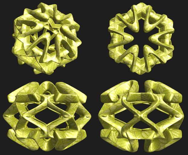 | Keywords: mathematica 3d cg parametricplot3d texture torus 輪環 りんかん ドーナツ どーなつ 六芒星 ろくぼうせい 六光星 ろくこうせい 六稜星 ろくりょうせい code program algorithm コード プログラム アルゴリズム hexagram geometric sculpture geometricsculpture shape geometry sculpture mapping テクスチャ マッピング 模様 もよう abstract 抽象 ちゅうしょう アブストラクト design pattern デザイン パターン graphic グラフィック グラフィクス structure 意匠 構造 symmetry 対称性 たいしょうせい シンメトリー 対称 たいしょう algorithm コード indoor black background foliage plant a = 5; (* center hole size of a torus *) b = 6; (* hexa-torus *) c = -10; (* distance from the center of rotation *) d = 6; (* number of torus *) h = 2; (* height of a torus *) SetOptions[ParametricPlot3D, PlotRange -> Full, Mesh -> None, Boxed -> False, Axes -> False, PlotPoints -> 400, ImageSize -> 1600, Background -> RGBColor[{30, 30, 30}/255], PlotStyle -> Directive[Specularity[White, 30], Texture[Import["D:/tmp/71.jpg"]]], TextureCoordinateFunction -> ({#4, #5 b Pi} &), Lighting -> "Neutral"]; f[v_] := Sin[2 Sin[Sin[Sin[v]]]]; x = (a - Cos[t] - Sin[b s]) Cos[s + Pi/(2 b)]; y = (a - Cos[t] - Sin[b s]) Sin[s + Pi/(2 b)]; z = (a - f[t] - h Sin[b s]) + c; rm = Table[{x, y, z}.RotationMatrix[2 i Pi/d, {1, 0, 0}], {i, d}]; ParametricPlot3D[rm, {t, 0, 2 Pi}, {s, 0, 2 Pi}] (*--- The Texture *) a = 5; (* center hole size of a torus *) b = 6; (* hexa-torus *) c = -10; (* distance from the center of rotation *) d = 6; (* number of torus *) h = 2; (* height of a torus *) SetOptions[ParametricPlot3D, PlotRange -> Full, Mesh -> None, Boxed -> False, Axes -> False, PlotPoints -> 400, ImageSize -> 1600, Background -> RGBColor[{30, 30, 30}/255], PlotStyle -> Directive[Specularity[White, 30], Texture[Import["D:/tmp/71.jpg"]]], TextureCoordinateFunction -> ({#4, #5 b Pi} &), Lighting -> "Neutral"]; f[v_] := Sin[2 Sin[Sin[Sin[v]]]]; x = (a - Cos[t] - Sin[b s]) Cos[s + Pi/(2 b)]; y = (a - Cos[t] - Sin[b s]) Sin[s + Pi/(2 b)]; z = (a - f[t] - h Sin[b s]) + c; rm = Table[{x, y, z}.RotationMatrix[2 i Pi/d, {1, 0, 0}], {i, d}]; ParametricPlot3D[rm, {t, 0, 2 Pi}, {s, 0, 2 Pi}] (*--- The Texture *) |