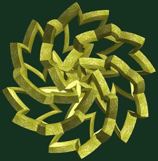 | Keywords: mathematica 3d cg parametricplot3d texture torus code program algorithm プログラム コード アルゴリズム 輪環 りんかん ドーナツ どーなつ 八芒星 はちぼうせい geometric sculpture geometricsculpture shape geometry sculpture mapping テクスチャ マッピング 模様 もよう abstract 抽象 ちゅうしょう アブストラクト design pattern デザイン パターン graphic グラフィック グラフィクス structure 意匠 構造 symmetry 対称性 たいしょうせい シンメトリー 対称 たいしょう organic pattern outdoor a = 6; (* center hole size *) b = 8; (* octa-torus *) c = 5; (* distance from the center of rotation *) d = 6; (* number of torus *) h = 2; (* height of a torus *) SetOptions[ParametricPlot3D, PlotRange -> Full, Mesh -> None, Boxed -> False, Axes -> False, PlotPoints -> 400, ImageSize -> 3000, Background -> RGBColor[{20, 50, 30}/255], PlotStyle -> Directive[Specularity[White, 30], Texture[Import["D:/tmp/71.jpg"]]], TextureCoordinateFunction -> ({#4, #5 Pi} &), Lighting -> "Neutral"]; f[v_] := TriangleWave[{-1, 1}, v/(2 Pi)]; g[v_] := TriangleWave[{-1, 1}, v/(2 Pi) + 1/4]; x = (a - g[t] - f[b s]) Cos[s] + c; y = (a - g[t] - f[b s]) Sin[s] + c; z = (a - f[t] - h f[b s]); rm = Table[{x, y, z}.RotationMatrix[2 i Pi/d, {0, 1, 2}], {i, d}]; ParametricPlot3D[rm, {t, 0, 2 Pi}, {s, 0, Pi}] (*--- The Texture *) a = 6; (* center hole size *) b = 8; (* octa-torus *) c = 5; (* distance from the center of rotation *) d = 6; (* number of torus *) h = 2; (* height of a torus *) SetOptions[ParametricPlot3D, PlotRange -> Full, Mesh -> None, Boxed -> False, Axes -> False, PlotPoints -> 400, ImageSize -> 3000, Background -> RGBColor[{20, 50, 30}/255], PlotStyle -> Directive[Specularity[White, 30], Texture[Import["D:/tmp/71.jpg"]]], TextureCoordinateFunction -> ({#4, #5 Pi} &), Lighting -> "Neutral"]; f[v_] := TriangleWave[{-1, 1}, v/(2 Pi)]; g[v_] := TriangleWave[{-1, 1}, v/(2 Pi) + 1/4]; x = (a - g[t] - f[b s]) Cos[s] + c; y = (a - g[t] - f[b s]) Sin[s] + c; z = (a - f[t] - h f[b s]); rm = Table[{x, y, z}.RotationMatrix[2 i Pi/d, {0, 1, 2}], {i, d}]; ParametricPlot3D[rm, {t, 0, 2 Pi}, {s, 0, Pi}] (*--- The Texture *) |