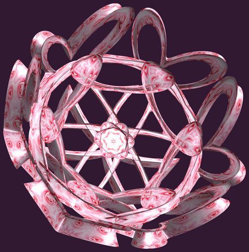 Keywords: mathematica 3d cg parametricplot3d texture torus 輪環 りんかん ドーナツ どーなつ 五芒星 ごぼうせい 五光星 ごこうせい 五稜星 ごりょうせい code program algorithm コード プログラム アルゴリズム pentagram geometric sculpture geometricsculpture shape geometry sculpture mapping テクスチャ マッピング 模様 もよう abstract 抽象 ちゅうしょう アブストラクト design pattern デザイン パターン graphic グラフィック グラフィクス structure 意匠 構造 symmetry 対称性 たいしょうせい シンメトリー 対称 たいしょう algorithm コード black background tangle wheel surreal a = 2; (* center hole size of a torus *) b = 5; (* penta-torus *) c = 3; (* distance from the center of rotation *) d = 6; (* number of torus *) h = 1; (* height of a torus *) SetOptions[ParametricPlot3D, PlotRange -> Full, Mesh -> None, Boxed -> False, Axes -> False, PlotPoints -> 400, ImageSize -> 3000, Background -> RGBColor[{50, 25, 50}/255], PlotStyle -> Directive[Specularity[White, 30], Texture[Import["D:/tmp/86.jpg"]]], TextureCoordinateFunction -> ({#4, #5 2 Pi} &), Lighting -> "Neutral"]; f[v_] := Cos[2 Cos[Cos[Cos[v]]]]; x = (a - f[t] - Sin[b s]) Cos[s + 3 Pi/(4 b)] + c; y = (a - f[t] - Sin[b s]) Sin[s + 3 Pi/(4 b)] + c; z = (a - Sin[t/2] - h Sin[b s]); rot = Table[{x, y, z}.RotationMatrix[2 i Pi/d, {1, 1, 2}], {i, d}]; ParametricPlot3D[rot, {t, 0, 2 Pi}, {s, 0, 2 Pi}] (*--- The Texture *) a = 2; (* center hole size of a torus *) b = 5; (* penta-torus *) c = 3; (* distance from the center of rotation *) d = 6; (* number of torus *) h = 1; (* height of a torus *) SetOptions[ParametricPlot3D, PlotRange -> Full, Mesh -> None, Boxed -> False, Axes -> False, PlotPoints -> 400, ImageSize -> 3000, Background -> RGBColor[{50, 25, 50}/255], PlotStyle -> Directive[Specularity[White, 30], Texture[Import["D:/tmp/86.jpg"]]], TextureCoordinateFunction -> ({#4, #5 2 Pi} &), Lighting -> "Neutral"]; f[v_] := Cos[2 Cos[Cos[Cos[v]]]]; x = (a - f[t] - Sin[b s]) Cos[s + 3 Pi/(4 b)] + c; y = (a - f[t] - Sin[b s]) Sin[s + 3 Pi/(4 b)] + c; z = (a - Sin[t/2] - h Sin[b s]); rot = Table[{x, y, z}.RotationMatrix[2 i Pi/d, {1, 1, 2}], {i, d}]; ParametricPlot3D[rot, {t, 0, 2 Pi}, {s, 0, 2 Pi}] (*--- The Texture *)