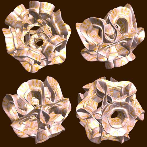 | Keywords: mathematica 3d cg parametricplot3d texture torus 輪環 りんかん ドーナツ どーなつ 五芒星 ごぼうせい 五光星 ごこうせい 五稜星 ごりょうせい code program algorithm コード プログラム アルゴリズム pentagram geometric sculpture geometricsculpture shape geometry sculpture mapping テクスチャ マッピング 模様 もよう abstract 抽象 ちゅうしょう アブストラクト design pattern デザイン パターン graphic グラフィック グラフィクス structure 意匠 構造 symmetry 対称性 たいしょうせい シンメトリー 対称 たいしょう algorithm コード black background indoor surreal photo border a = 4; (* center hole size of a torus *) b = 5; (* penta-torus *) c = 6; (* distance from the center of rotation *) d = 6; (* number of torus *) h = 1; (* height of a torus *) SetOptions[ParametricPlot3D, PlotRange -> Full, Mesh -> None, Boxed -> False, Axes -> False, PlotPoints -> 400, ImageSize -> 1600, Background -> Darker[Orange, 0.8], PlotStyle -> Directive[Specularity[White, 30], Texture[Import["D:/tmp/861.jpg"]]], TextureCoordinateFunction -> ({#4, #5 2 Pi} &), Lighting -> "Neutral"]; f[v_] := Sin[2 Sin[Sin[Sin[v]]]]; g[v_] := Sum[Cos[(2 k - 1) v]/(2 k - 1), {k, 4}]; x = (a - g[t] - f[b s]) Cos[s + 3 Pi/(4 b)] + c; y = (a - g[t] - f[b s]) Sin[s + 3 Pi/(4 b)] + c; z = (a - Sin[t] - h f[b s]); rot = Table[{x, y, z}.RotationMatrix[2 i Pi/d, {1, 1, 1}], {i, d}]; ParametricPlot3D[rot, {t, 0, 2 Pi}, {s, 0, 2 Pi}] (*--- The Texture *) a = 4; (* center hole size of a torus *) b = 5; (* penta-torus *) c = 6; (* distance from the center of rotation *) d = 6; (* number of torus *) h = 1; (* height of a torus *) SetOptions[ParametricPlot3D, PlotRange -> Full, Mesh -> None, Boxed -> False, Axes -> False, PlotPoints -> 400, ImageSize -> 1600, Background -> Darker[Orange, 0.8], PlotStyle -> Directive[Specularity[White, 30], Texture[Import["D:/tmp/861.jpg"]]], TextureCoordinateFunction -> ({#4, #5 2 Pi} &), Lighting -> "Neutral"]; f[v_] := Sin[2 Sin[Sin[Sin[v]]]]; g[v_] := Sum[Cos[(2 k - 1) v]/(2 k - 1), {k, 4}]; x = (a - g[t] - f[b s]) Cos[s + 3 Pi/(4 b)] + c; y = (a - g[t] - f[b s]) Sin[s + 3 Pi/(4 b)] + c; z = (a - Sin[t] - h f[b s]); rot = Table[{x, y, z}.RotationMatrix[2 i Pi/d, {1, 1, 1}], {i, d}]; ParametricPlot3D[rot, {t, 0, 2 Pi}, {s, 0, 2 Pi}] (*--- The Texture *) |