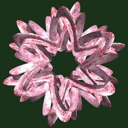 Keywords: mathematica 3d cg parametricplot3d texture torus 輪環 りんかん ドーナツ どーなつ 四芒星 しぼうせい 四光星 しこうせい 四稜星 しりょうせい code program algorithm コード プログラム アルゴリズム geometric sculpture geometricsculpture shape geometry sculpture mapping テクスチャ マッピング 模様 もよう abstract 抽象 ちゅうしょう アブストラクト design pattern デザイン パターン graphic グラフィック グラフィクス structure 意匠 構造 symmetry 対称性 たいしょうせい シンメトリー 対称 たいしょう algorithm コード plant blossom black background pastel outdoor organic pattern serene flower cluster foliage flower macro a = 3; (* center hole size of a torus *) b = 4; (* tetra-torus *) c = 0; (* distance from the center of rotation *) d = 6; (* number of torus *) h = 1; (* height of a torus *) SetOptions[ParametricPlot3D, PlotRange -> Full, Mesh -> None, Boxed -> False, Axes -> False, PlotPoints -> 400, ImageSize -> 3000, Background -> RGBColor[{25, 50, 25}/255], PlotStyle -> Directive[Specularity[White, 30], Texture[Import["D:/tmp/86.jpg"]]], TextureCoordinateFunction -> ({#4, #5 2 Pi} &), Lighting -> "Neutral"]; f[v_] := Cos[2 Cos[Cos[Cos[v]]]]; x = (a - f[t] - Sin[b s]) Cos[s + 3 Pi/(4 b)] + c; y = (a - f[t] - Sin[b s]) Sin[s + 3 Pi/(4 b)] + c; z = (a - Sin[t/2] - h Sin[b s]); rot = Table[{x, y, z}.RotationMatrix[2 i Pi/d, {1, 1, 0}], {i, d}]; ParametricPlot3D[rot, {t, 0, 2 Pi}, {s, 0, 2 Pi}] (*--- The Texture *) a = 3; (* center hole size of a torus *) b = 4; (* tetra-torus *) c = 0; (* distance from the center of rotation *) d = 6; (* number of torus *) h = 1; (* height of a torus *) SetOptions[ParametricPlot3D, PlotRange -> Full, Mesh -> None, Boxed -> False, Axes -> False, PlotPoints -> 400, ImageSize -> 3000, Background -> RGBColor[{25, 50, 25}/255], PlotStyle -> Directive[Specularity[White, 30], Texture[Import["D:/tmp/86.jpg"]]], TextureCoordinateFunction -> ({#4, #5 2 Pi} &), Lighting -> "Neutral"]; f[v_] := Cos[2 Cos[Cos[Cos[v]]]]; x = (a - f[t] - Sin[b s]) Cos[s + 3 Pi/(4 b)] + c; y = (a - f[t] - Sin[b s]) Sin[s + 3 Pi/(4 b)] + c; z = (a - Sin[t/2] - h Sin[b s]); rot = Table[{x, y, z}.RotationMatrix[2 i Pi/d, {1, 1, 0}], {i, d}]; ParametricPlot3D[rot, {t, 0, 2 Pi}, {s, 0, 2 Pi}] (*--- The Texture *) |