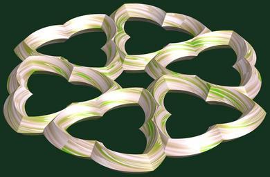 | Keywords: mathematica 3d cg parametricplot3d texture torus code program algorithm tri-torus tritorus プログラム コード アルゴリズム 輪環 りんかん ドーナツ どーなつ 三芒星 さんぼうせい geometric sculpture geometricsculpture shape geometry sculpture mapping テクスチャ マッピング 模様 もよう abstract 抽象 ちゅうしょう アブストラクト design pattern デザイン パターン graphic グラフィック グラフィクス structure 意匠 構造 symmetry 対称性 たいしょうせい シンメトリー 対称 たいしょう black background a = 4; (* center hole size *) b = 3; (* tri-torus *) c = 5; (* distance from the center of rotation *) d = 6; (* number of torus *) h = 0; (* height of a torus *) SetOptions[ParametricPlot3D, PlotRange -> Full, Mesh -> None, Boxed -> False, Axes -> False, PlotPoints -> 400, ImageSize -> 3000, Background -> RGBColor[{20, 50, 30}/255], PlotStyle -> Directive[Specularity[White, 40], Texture[Import["D:/tmp/862.jpg"]]], TextureCoordinateFunction -> ({#4 + #5, #5 / Pi} &), Lighting -> "Neutral"]; f[v_] := TriangleWave[{-1, 1}, v/(2 Pi)]; g[v_] := TriangleWave[{-1, 1}, v/(2 Pi) + 1/4]; x = (a - g[t] - f[b s]) Cos[s] + c; y = (a - g[t] - f[b s]) Sin[s] + c; z = (a - f[t] - h f[b s]); rm = Table[{x, y, z}.RotationMatrix[2 i Pi/d, {0, 0, 1}], {i, d}]; ParametricPlot3D[rm, {t, 0, 2 Pi}, {s, 0, Pi}] (*--- The Texture *) a = 4; (* center hole size *) b = 3; (* tri-torus *) c = 5; (* distance from the center of rotation *) d = 6; (* number of torus *) h = 0; (* height of a torus *) SetOptions[ParametricPlot3D, PlotRange -> Full, Mesh -> None, Boxed -> False, Axes -> False, PlotPoints -> 400, ImageSize -> 3000, Background -> RGBColor[{20, 50, 30}/255], PlotStyle -> Directive[Specularity[White, 40], Texture[Import["D:/tmp/862.jpg"]]], TextureCoordinateFunction -> ({#4 + #5, #5 / Pi} &), Lighting -> "Neutral"]; f[v_] := TriangleWave[{-1, 1}, v/(2 Pi)]; g[v_] := TriangleWave[{-1, 1}, v/(2 Pi) + 1/4]; x = (a - g[t] - f[b s]) Cos[s] + c; y = (a - g[t] - f[b s]) Sin[s] + c; z = (a - f[t] - h f[b s]); rm = Table[{x, y, z}.RotationMatrix[2 i Pi/d, {0, 0, 1}], {i, d}]; ParametricPlot3D[rm, {t, 0, 2 Pi}, {s, 0, Pi}] (*--- The Texture *) |