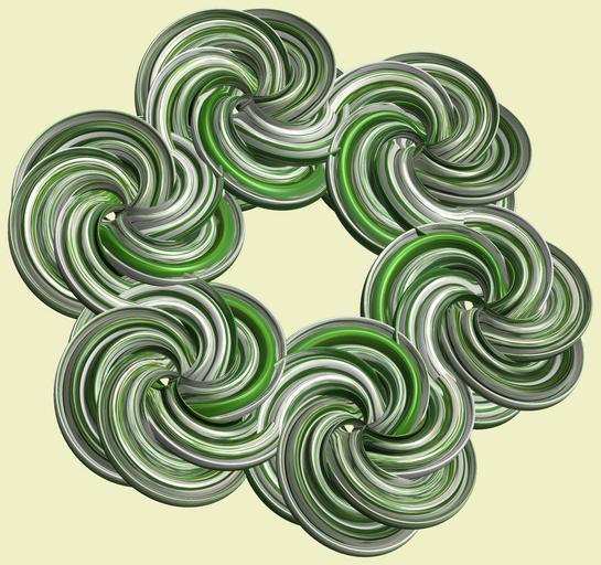 | Keywords: mathematica 3d cg parametricplot3d texture torus code program algorithm プログラム コード アルゴリズム 輪環 りんかん ドーナツ どーなつ トーラス とーらす knot 結び目 むすびめ mapping テクスチャ マッピング 模様 もよう design pattern デザイン パターン graphic グラフィック グラフィクス structure 意匠 構造 symmetry 対称性 たいしょうせい シンメトリー 対称 たいしょう drawing indoor white background tangle a = 6; (* center hole size of a torus *) b1 = 5;(* the number of angles *) b2 = 4;(* the number of waves *) b3 = 4; (* the number of knots *) c = 14; (* distance from the center of rotation *) d = 6; (* the number of tori *) h1 = 3; (* width of a torus *) h2 = 4; (* width of a torus *) h3 = 3; (* height of cross *) SetOptions[ParametricPlot3D, PlotRange -> Full, Mesh -> None, Boxed -> False, Axes -> None, PlotPoints -> 500, ImageSize -> 3000, Background -> RGBColor[{240, 240, 200}/255], PlotStyle -> Directive[Specularity[White, 50], Texture[Import["D:/tmp/911.jpg"]]], TextureCoordinateFunction -> ({#4, #5 /Pi} &), Lighting -> "Neutral"]; x = (a - h1 Cos[t] + h2 Sin[b1 s]) Cos[b3 s] + c; y = (a - h1 Cos[t] + h2 Sin[b1 s]) Sin[b3 s] + c; z = h3 Cos[b1 s] + Sin[b2 t] + c; rm = Table[{x, y, z}.RotationMatrix[2 i Pi/d, {0, 0, 1}], {i, d}]; ParametricPlot3D[rm, {t, 0, 2 Pi}, {s, 0, 2 Pi}] (*--- The Texture *) a = 6; (* center hole size of a torus *) b1 = 5;(* the number of angles *) b2 = 4;(* the number of waves *) b3 = 4; (* the number of knots *) c = 14; (* distance from the center of rotation *) d = 6; (* the number of tori *) h1 = 3; (* width of a torus *) h2 = 4; (* width of a torus *) h3 = 3; (* height of cross *) SetOptions[ParametricPlot3D, PlotRange -> Full, Mesh -> None, Boxed -> False, Axes -> None, PlotPoints -> 500, ImageSize -> 3000, Background -> RGBColor[{240, 240, 200}/255], PlotStyle -> Directive[Specularity[White, 50], Texture[Import["D:/tmp/911.jpg"]]], TextureCoordinateFunction -> ({#4, #5 /Pi} &), Lighting -> "Neutral"]; x = (a - h1 Cos[t] + h2 Sin[b1 s]) Cos[b3 s] + c; y = (a - h1 Cos[t] + h2 Sin[b1 s]) Sin[b3 s] + c; z = h3 Cos[b1 s] + Sin[b2 t] + c; rm = Table[{x, y, z}.RotationMatrix[2 i Pi/d, {0, 0, 1}], {i, d}]; ParametricPlot3D[rm, {t, 0, 2 Pi}, {s, 0, 2 Pi}] (*--- The Texture *) |