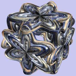 | Keywords: mathematica 3d cg parametricplot3d texture torus code program algorithm プログラム コード アルゴリズム 輪環 りんかん ドーナツ どーなつ トーラス とーらす mapping テクスチャ マッピング 模様 もよう abstract 抽象 ちゅうしょう アブストラクト design pattern デザイン パターン graphic グラフィック グラフィクス structure 意匠 構造 symmetry 対称性 たいしょうせい シンメトリー 対称 たいしょう indoor white background vehicle motorcycle bike tangle surreal a = 7; (* center hole size of a torus *) b1 = 6;(* the number of angles *) b2 = 6;(* the number of waves *) c = 13; (* distance from the center of rotation *) d = 6; (* the number of tori *) h1 = 6; (* width of a torus *) h2 = 3; (* width of a torus *) SetOptions[ParametricPlot3D, PlotRange -> Full, Mesh -> None, Boxed -> False, Axes -> None, PlotPoints -> 500, ImageSize -> 3000, Background -> RGBColor[{200, 200, 240}/255], PlotStyle -> Directive[Specularity[White, 70], Texture[Import["D:/tmp/94.jpg"]]], TextureCoordinateFunction -> ({#4, #5 Pi} &), Lighting -> "Neutral"]; x = (a - h1 Cos[t] + h2 Sin[b1 s]) Cos[s + Pi/(2 b1)]; y = (a - h1 Cos[t] + h2 Sin[b1 s]) Sin[s + Pi/(2 b1)]; z = Sin[b2 t] + c; vc = {{0, 0, 1}, {0, 0, -1}, {0, 1, 0}, {0, -1, 0}, {1, 0, 0}, {-1, 0, 0}}; rm = Table[{x, y, z}.RotationMatrix[{{0, 0, 1}, vc[[i]]}], {i, d}]; ParametricPlot3D[rm, {t, 0, 2 Pi}, {s, 0, 2 Pi}] (*--- The Texture *) a = 7; (* center hole size of a torus *) b1 = 6;(* the number of angles *) b2 = 6;(* the number of waves *) c = 13; (* distance from the center of rotation *) d = 6; (* the number of tori *) h1 = 6; (* width of a torus *) h2 = 3; (* width of a torus *) SetOptions[ParametricPlot3D, PlotRange -> Full, Mesh -> None, Boxed -> False, Axes -> None, PlotPoints -> 500, ImageSize -> 3000, Background -> RGBColor[{200, 200, 240}/255], PlotStyle -> Directive[Specularity[White, 70], Texture[Import["D:/tmp/94.jpg"]]], TextureCoordinateFunction -> ({#4, #5 Pi} &), Lighting -> "Neutral"]; x = (a - h1 Cos[t] + h2 Sin[b1 s]) Cos[s + Pi/(2 b1)]; y = (a - h1 Cos[t] + h2 Sin[b1 s]) Sin[s + Pi/(2 b1)]; z = Sin[b2 t] + c; vc = {{0, 0, 1}, {0, 0, -1}, {0, 1, 0}, {0, -1, 0}, {1, 0, 0}, {-1, 0, 0}}; rm = Table[{x, y, z}.RotationMatrix[{{0, 0, 1}, vc[[i]]}], {i, d}]; ParametricPlot3D[rm, {t, 0, 2 Pi}, {s, 0, 2 Pi}] (*--- The Texture *) |