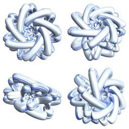 Keywords: mathematica 3d cg parametricplot3d texture torus 輪環 りんかん ドーナツ どーなつ 六芒星 ろくぼうせい 六光星 六稜星 ろくこうせい ろくりょうせい program プログラム code コード algorithm コード アルゴリズム hexagram geometric sculpture geometricsculpture shape geometry sculpture mapping テクスチャ マッピング 模様 もよう design pattern デザイン パターン graphic グラフィック グラフィクス structure 意匠 構造 symmetry 対称性 たいしょうせい シンメトリー 対称 たいしょう algorithm white background drawing cartoon indoor SetOptions[ParametricPlot3D, PlotRange -> Full, Mesh -> None, Boxed -> False, Axes -> None, PlotPoints -> 400, ImageSize -> 1000, PlotStyle -> Directive[Specularity[White, 30], Texture[Import["D:/tmp/863.jpg"]]], TextureCoordinateFunction -> ({#4 + 2 #5, #5/Pi} &), Lighting -> "Neutral"]; a = 4; (* center hole size of a torus *) b = 6; (* hexa-torus *) c = 3; (* distance from the center of rotation *) d = 7; (* number of torus *) f[v_] := Sum[Sin[(2 k - 1) v]/(2 k - 1), {k, 4}]; x = (a - Cos[t] - Sin[b s]) Cos[s + Pi/(2 b)] + c; y = Sin[t] + c; z = (a - Cos[t] - Sin[b s]) f[s + Pi/(2 b)] + c; rot = Table[{x, y, z}.RotationMatrix[2 i Pi/d, {1, 1, 0}], {i, d}]; ParametricPlot3D[rot, {t, 0, 2 Pi}, {s, 0, 2 Pi}] (*--- The Texture The g[] is a 4-partial sum of the Fourier series for Square wave. g[]は矩形波のフーリエ展開の最初の4項 *) SetOptions[ParametricPlot3D, PlotRange -> Full, Mesh -> None, Boxed -> False, Axes -> None, PlotPoints -> 400, ImageSize -> 1000, PlotStyle -> Directive[Specularity[White, 30], Texture[Import["D:/tmp/863.jpg"]]], TextureCoordinateFunction -> ({#4 + 2 #5, #5/Pi} &), Lighting -> "Neutral"]; a = 4; (* center hole size of a torus *) b = 6; (* hexa-torus *) c = 3; (* distance from the center of rotation *) d = 7; (* number of torus *) f[v_] := Sum[Sin[(2 k - 1) v]/(2 k - 1), {k, 4}]; x = (a - Cos[t] - Sin[b s]) Cos[s + Pi/(2 b)] + c; y = Sin[t] + c; z = (a - Cos[t] - Sin[b s]) f[s + Pi/(2 b)] + c; rot = Table[{x, y, z}.RotationMatrix[2 i Pi/d, {1, 1, 0}], {i, d}]; ParametricPlot3D[rot, {t, 0, 2 Pi}, {s, 0, 2 Pi}] (*--- The Texture The g[] is a 4-partial sum of the Fourier series for Square wave. g[]は矩形波のフーリエ展開の最初の4項 *) |