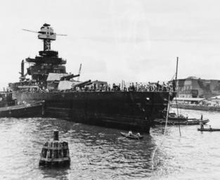 Keywords: monochrome blackandwhite outdoor waterfront water vehicle boat black and white 80-G-19934: Japanese Attack on Pearl Harbor, Territory of Hawaii, 7 December 1941. USS West Virginia (BB 48), sunk at her berth by Japanese torpedoes and bombs, was sufficiently raised to drydock. She is being maneuvered by tugs, preliminary to the start of repairs. (4/7/2015). 80-G-19934: Japanese Attack on Pearl Harbor, Territory of Hawaii, 7 December 1941. USS West Virginia (BB 48), sunk at her berth by Japanese torpedoes and bombs, was sufficiently raised to drydock. She is being maneuvered by tugs, preliminary to the start of repairs. (4/7/2015). |