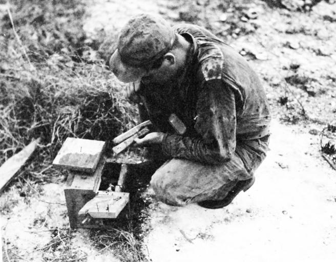 | Keywords: blackandwhite monochrome outdoor black and white 80-G-259270:  Japanese land mine consisting of a wooden box containing dynamite and detonator with weight suspended over explosive.  This trap was installed in ruined building some distance from a Japanese pillbox, in the vicinity of Iloilo Harbor, Panay, Philippines  Photographed by Lieutenant Junior Grade C.F. Waterman, CPU-8, March, 22, 1945.  (5/26/2015).  80-G-259270:  Japanese land mine consisting of a wooden box containing dynamite and detonator with weight suspended over explosive.  This trap was installed in ruined building some distance from a Japanese pillbox, in the vicinity of Iloilo Harbor, Panay, Philippines  Photographed by Lieutenant Junior Grade C.F. Waterman, CPU-8, March, 22, 1945.  (5/26/2015).   |