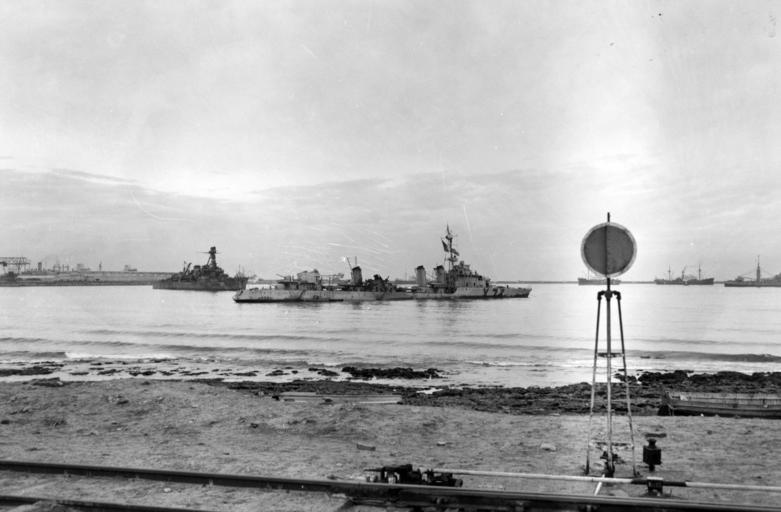 | Keywords: 80-G-30649: North African Invasion, November 1942. French destroyer Albatros beached off Casablanca, Morocco on 4 December 1942. Beyond her stern is the French light cruiser Primauguet. Both ships were badly damaged during the Battle of Casablanca, 8 November 1942. Albatros' third smokestack has been destroyed and Primaguet is largely burned out forward. Note the railroad line and signal in the foreground and shipping in the right distance, including at least two French commercial freighters and, partially visible at far right, what appears to be USS Electra (AK-21) lying very low in the water. She had been torpedoed by the German submarine U-173 on 15 November. Official U.S. Navy Photograph, now in the collections of the National Archives. 80-G-30649: North African Invasion, November 1942. French destroyer Albatros beached off Casablanca, Morocco on 4 December 1942. Beyond her stern is the French light cruiser Primauguet. Both ships were badly damaged during the Battle of Casablanca, 8 November 1942. Albatros' third smokestack has been destroyed and Primaguet is largely burned out forward. Note the railroad line and signal in the foreground and shipping in the right distance, including at least two French commercial freighters and, partially visible at far right, what appears to be USS Electra (AK-21) lying very low in the water. She had been torpedoed by the German submarine U-173 on 15 November. Official U.S. Navy Photograph, now in the collections of the National Archives. |
