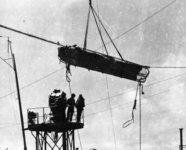 | Keywords: blackandwhite monochrome black and white 80-G-32381: Battle of Midway, June 4, 1942. Wounded crew member from USS Yorktown being high-lined transferred from USS Benham (DD-397) to USS Portland (CA-33). A report of unidentified aircraft caused Benham to break away before transferring any of the survivors to the cruiser and they remained on board her until the following morning. (9/15/15). 80-G-32381: Battle of Midway, June 4, 1942. Wounded crew member from USS Yorktown being high-lined transferred from USS Benham (DD-397) to USS Portland (CA-33). A report of unidentified aircraft caused Benham to break away before transferring any of the survivors to the cruiser and they remained on board her until the following morning. (9/15/15). |
