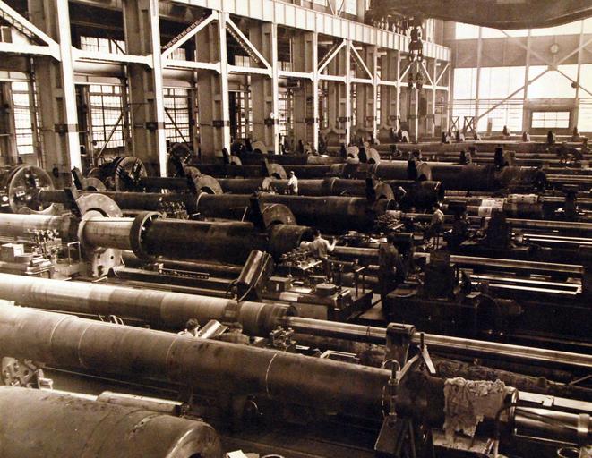 Keywords: 80-G-40986: Naval Gun Factory, Washington, Navy Yard, Washington, D.C. These huge gun barrels have reached the finishing stages of boring. With packed bits, machines are cutting away the remaining surplus steel. Photograph released March 31, 1943. Official U.S. Navy Photograph, now in the collections of the National Archives. (2016/12/20). 80-G-40986: Naval Gun Factory, Washington, Navy Yard, Washington, D.C. These huge gun barrels have reached the finishing stages of boring. With packed bits, machines are cutting away the remaining surplus steel. Photograph released March 31, 1943. Official U.S. Navy Photograph, now in the collections of the National Archives. (2016/12/20).