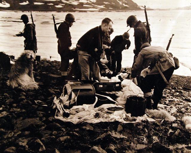 Keywords: outdoor 80-G-43837: Mixed landing forces of U.S. Coast Guard and Army Commandos, members of the U.S. Navy’s Greenland’s Patrol Expeditionary Force, search the rugged terrain of Greenland for remnants of a German Naval and Military force which were operating a radio base there. One prisoner was captured, others had evacuated. Shown: Examining an abandoned Nazi parachute kit found on the site of the German Army’s radio base. Food, hand grenades, and other material were abandoned by the Nazis following the attack on the base by an American Army Air Force. The Germans presumably were evacuated by plane. Photograph released November 20, 1943. (2015/10/13). 80-G-43837: Mixed landing forces of U.S. Coast Guard and Army Commandos, members of the U.S. Navy’s Greenland’s Patrol Expeditionary Force, search the rugged terrain of Greenland for remnants of a German Naval and Military force which were operating a radio base there. One prisoner was captured, others had evacuated. Shown: Examining an abandoned Nazi parachute kit found on the site of the German Army’s radio base. Food, hand grenades, and other material were abandoned by the Nazis following the attack on the base by an American Army Air Force. The Germans presumably were evacuated by plane. Photograph released November 20, 1943. (2015/10/13). |