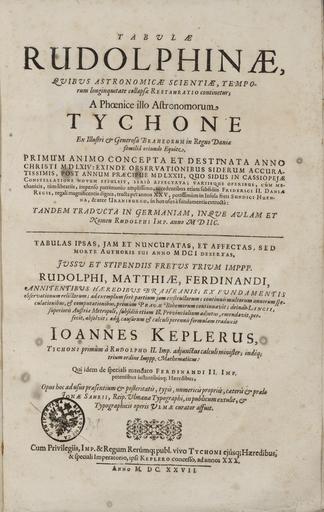 Keywords: 8107-2Keplertp.png en Tabulae Rudolphinae quibus astronomicae scientiae temporum longuinquitate collapsae Restauratio continetur; A Phoenice illo Astronomorum Tycho Ex Illustri Generosa Braheorum in Regni Daniae familiâ oriundo Equite Jona Saurius Saur Johann Sauer Johannes; Saurius Johannes Ulm 1627 The title page of Johannes Kepler's Rudolphine Tables 1627 the most accurate and comprehensive star catalogue and planetary tables published up until that time It contained the positions of over 1000 stars and directions for locating the planets within our solar system Kepler finished the work in 1623 and dedicated it to his patron the Emperor Rudolf II but actually published it in 1627 It is the first scientific work which extensively employs the new concept of logarithms The table's findings support Kepler's laws and the theory of a heliocentric astronomy http //mathdl maa org/images/upload_library/46/Plimpton-Smith/8107-2Keplertp tif stamp Oenipontana Biblioteca Library of Innsbruck Creator Johannes Kepler 1627 PD-old-100-1923 Tabulae Rudolphinae 1627 books Frontispieces from Austria |