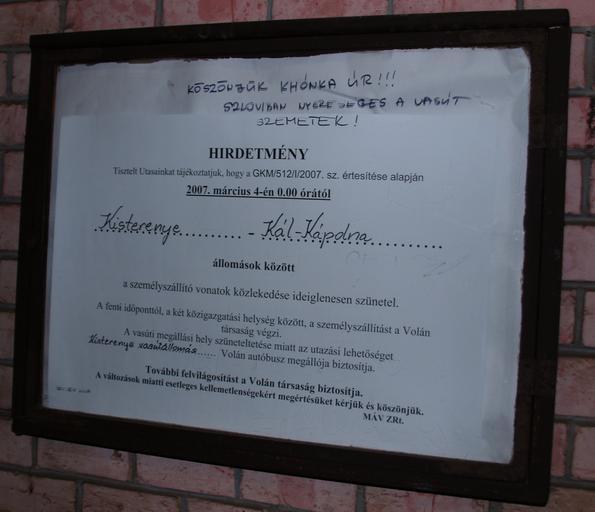 | Keywords: 84-es vasútvonal vonalbezárás hirdetmény.jpg A Kisterenye Kál-Kápolna vasútvonal bezárását közlő hirdetmény és egy utas kommentárja Official statement on the closure of the Kisterenye Kál-Kápolna railway line in Hungary<br>Dear Passengers The railway traffic between Kisterenye and Kál-Kápolna after 2007-03-04 00 00 will be temporarily disolved <br> Passenger's comment Thank You Mr Kóka minister of transport; 2007 The Slovakian railway is profitable bastards Transferred from http //hu wikipedia org hu wikipedia; transferred to Commons by User Beroesz using http //tools wikimedia de/~magnus/commonshelper php CommonsHelper <br>Átmozgatva User Beroesz által a http //tools wikimedia de/~magnus/commonshelper php CommonsHelper segítségével a http //hu wikipedia org Magyar Wikipédiából<br> Original upload log; Eredeti feltöltési bejegyzés 2009-02-28 16 04 IJoe 12801102 243147 bytes <nowiki> leírás Utastájékoztató 2007 március 4-ei szolgálatváltásról forrás saját kép dátum 2007 03 03 helyszín Kisterenye MÁV állomás szerző Birincsik József enge</nowiki> Date 2007 03 03 picture taken; kép készült 2009 02 28 original upload date eredeti feltöltési dátum IJoe Birincsik József IJoe hu Kisterenye Kál-Kápolna railway line 2007 in rail transport in Hungary |