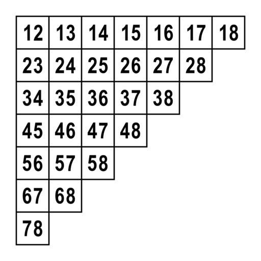 Keywords: 8 choose 2 array, pairs.svg Array of the <math>\tbinom 8 2 </math> 28 2-element subsets of an 8-element set own mate2code 250px 250px Triangular 8 choose 2 arrays