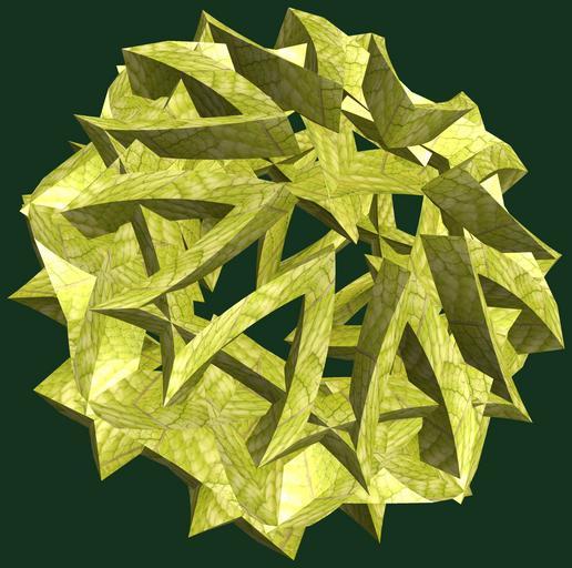 Keywords: mathematica 3d cg parametricplot3d texture torus code program algorithm プログラム コード アルゴリズム 輪環 りんかん ドーナツ どーなつ 六芒星 ろくぼうせい geometric sculpture geometricsculpture shape geometry sculpture mapping テクスチャ マッピング 模様 もよう abstract 抽象 ちゅうしょう アブストラクト design pattern デザイン パターン graphic グラフィック グラフィクス structure 意匠 構造 symmetry 対称性 たいしょうせい シンメトリー 対称 たいしょう leaf plant foliage organic pattern outdoor tree black background a = 4; (* center hole size *) b = 6; (* hexa-torus *) c = -9; (* distance from the center of rotation *) d = 8; (* number of torus *) h = 2; (* height of a torus *) SetOptions[ParametricPlot3D, PlotRange -> Full, Mesh -> None, Boxed -> False, Axes -> False, PlotPoints -> 400, ImageSize -> 3000, Background -> RGBColor[{20, 50, 30}/255], PlotStyle -> Directive[Specularity[White, 30], Texture[Import["D:/tmp/71.jpg"]]], TextureCoordinateFunction -> ({#4, #5 Pi} &), Lighting -> "Neutral"]; f[v_] := TriangleWave[{-1, 1}, v/(2 Pi)]; g[v_] := TriangleWave[{-1, 1}, v/(2 Pi) + 1/4]; x = (a - g[t] - f[b s]) Cos[s]; y = (a - g[t] - f[b s]) Sin[s]; z = (a - f[t] - h f[b s]) + c; rm = Table[{x, y, z}.RotationMatrix[2 i Pi/d, {1, 1, 0}], {i, d}]; ParametricPlot3D[rm, {t, 0, 2 Pi}, {s, 0, Pi}] (*--- The Texture *) a = 4; (* center hole size *) b = 6; (* hexa-torus *) c = -9; (* distance from the center of rotation *) d = 8; (* number of torus *) h = 2; (* height of a torus *) SetOptions[ParametricPlot3D, PlotRange -> Full, Mesh -> None, Boxed -> False, Axes -> False, PlotPoints -> 400, ImageSize -> 3000, Background -> RGBColor[{20, 50, 30}/255], PlotStyle -> Directive[Specularity[White, 30], Texture[Import["D:/tmp/71.jpg"]]], TextureCoordinateFunction -> ({#4, #5 Pi} &), Lighting -> "Neutral"]; f[v_] := TriangleWave[{-1, 1}, v/(2 Pi)]; g[v_] := TriangleWave[{-1, 1}, v/(2 Pi) + 1/4]; x = (a - g[t] - f[b s]) Cos[s]; y = (a - g[t] - f[b s]) Sin[s]; z = (a - f[t] - h f[b s]) + c; rm = Table[{x, y, z}.RotationMatrix[2 i Pi/d, {1, 1, 0}], {i, d}]; ParametricPlot3D[rm, {t, 0, 2 Pi}, {s, 0, Pi}] (*--- The Texture *) |