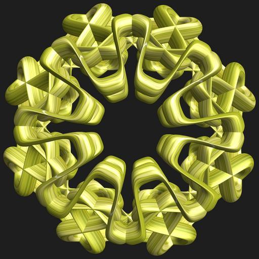 | Keywords: mathematica 3d cg parametricplot3d texture torus 輪環 りんかん ドーナツ どーなつ 八芒星 はちぼうせい 八光星 はちこうせい 八稜星 はちりょうせい code program algorithm コード プログラム アルゴリズム geometric sculpture geometricsculpture shape geometry sculpture mapping テクスチャ マッピング 模様 もよう abstract 抽象 ちゅうしょう アブストラクト design pattern デザイン パターン graphic グラフィック グラフィクス structure 意匠 構造 symmetry 対称性 たいしょうせい シンメトリー 対称 たいしょう algorithm コード black background organic pattern indoor a = 10; (* center hole size of a torus *) b = 8; (* octa-torus *) c = -18; (* distance from the center of rotation *) d = 8; (* number of torus *) h = 3; (* height of a torus *) SetOptions[ParametricPlot3D, PlotRange -> Full, Mesh -> None, Boxed -> False, Axes -> False, PlotPoints -> 400, ImageSize -> 3000, Background -> RGBColor[{30, 30, 30}/255], PlotStyle -> Directive[Specularity[White, 30], Texture[Import["D:/tmp/71.jpg"]]], TextureCoordinateFunction -> ({#4 + #5, #5/Pi} &), Lighting -> "Neutral"]; f[v_] := Sin[2 Sin[Sin[Sin[v]]]]; x = (a - Cos[t] - f[b s]) Cos[s + Pi/(2 b)]; y = (a - Cos[t] - f[b s]) Sin[s + Pi/(2 b)]; z = (a - Sin[t] - h f[b s]) + c; rm = Table[{x, y, z}.RotationMatrix[2 i Pi/d, {1, 0, 0}], {i, d}]; ParametricPlot3D[rm, {t, 0, 2 Pi}, {s, 0, 2 Pi}] (*--- The Texture *) a = 10; (* center hole size of a torus *) b = 8; (* octa-torus *) c = -18; (* distance from the center of rotation *) d = 8; (* number of torus *) h = 3; (* height of a torus *) SetOptions[ParametricPlot3D, PlotRange -> Full, Mesh -> None, Boxed -> False, Axes -> False, PlotPoints -> 400, ImageSize -> 3000, Background -> RGBColor[{30, 30, 30}/255], PlotStyle -> Directive[Specularity[White, 30], Texture[Import["D:/tmp/71.jpg"]]], TextureCoordinateFunction -> ({#4 + #5, #5/Pi} &), Lighting -> "Neutral"]; f[v_] := Sin[2 Sin[Sin[Sin[v]]]]; x = (a - Cos[t] - f[b s]) Cos[s + Pi/(2 b)]; y = (a - Cos[t] - f[b s]) Sin[s + Pi/(2 b)]; z = (a - Sin[t] - h f[b s]) + c; rm = Table[{x, y, z}.RotationMatrix[2 i Pi/d, {1, 0, 0}], {i, d}]; ParametricPlot3D[rm, {t, 0, 2 Pi}, {s, 0, 2 Pi}] (*--- The Texture *) |