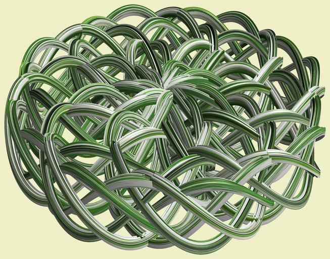| Keywords: mathematica 3d cg parametricplot3d texture torus code program algorithm プログラム コード アルゴリズム 輪環 りんかん ドーナツ どーなつ トーラス とーらす knot 結び目 むすびめ mapping テクスチャ マッピング 模様 もよう design pattern デザイン パターン graphic グラフィック グラフィクス structure 意匠 構造 symmetry 対称性 たいしょうせい シンメトリー 対称 たいしょう white background indoor a = 16; (* center hole size of a torus *) b1 = 9;(* the number of angles *) b2 = 4;(* the number of waves *) b3 = 4; (* the number of knots *) c = 12; (* distance from the center of rotation *) d = 8; (* the number of tori *) h1 = 1; (* width of a torus *) h2 = 1; (* width of a torus *) h3 = 8; (* height of cross *) SetOptions[ParametricPlot3D, PlotRange -> Full, Mesh -> None, Boxed -> False, Axes -> None, PlotPoints -> 500, ImageSize -> 3000, Background -> RGBColor[{240, 240, 200}/255], PlotStyle -> Directive[Specularity[White, 50], Texture[Import["D:/tmp/911.jpg"]]], TextureCoordinateFunction -> ({#4, #5 /Pi} &), Lighting -> "Neutral"]; x = (a - h1 Cos[t] + h2 Sin[b1 s]) Cos[b3 s] + c; y = (a - h1 Cos[t] + h2 Sin[b1 s]) Sin[b3 s] + c; z = h3 Cos[b1 s] + Sin[b2 t] + c; rm = Table[{x, y, z}.RotationMatrix[2 i Pi/d, {0, 0, 1}], {i, d}]; ParametricPlot3D[rm, {t, 0, 2 Pi}, {s, 0, 2 Pi}] (*--- The Texture *) a = 16; (* center hole size of a torus *) b1 = 9;(* the number of angles *) b2 = 4;(* the number of waves *) b3 = 4; (* the number of knots *) c = 12; (* distance from the center of rotation *) d = 8; (* the number of tori *) h1 = 1; (* width of a torus *) h2 = 1; (* width of a torus *) h3 = 8; (* height of cross *) SetOptions[ParametricPlot3D, PlotRange -> Full, Mesh -> None, Boxed -> False, Axes -> None, PlotPoints -> 500, ImageSize -> 3000, Background -> RGBColor[{240, 240, 200}/255], PlotStyle -> Directive[Specularity[White, 50], Texture[Import["D:/tmp/911.jpg"]]], TextureCoordinateFunction -> ({#4, #5 /Pi} &), Lighting -> "Neutral"]; x = (a - h1 Cos[t] + h2 Sin[b1 s]) Cos[b3 s] + c; y = (a - h1 Cos[t] + h2 Sin[b1 s]) Sin[b3 s] + c; z = h3 Cos[b1 s] + Sin[b2 t] + c; rm = Table[{x, y, z}.RotationMatrix[2 i Pi/d, {0, 0, 1}], {i, d}]; ParametricPlot3D[rm, {t, 0, 2 Pi}, {s, 0, 2 Pi}] (*--- The Texture *) |