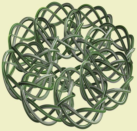 | Keywords: mathematica 3d cg parametricplot3d texture torus code program algorithm プログラム コード アルゴリズム 輪環 りんかん ドーナツ どーなつ トーラス とーらす knot 結び目 むすびめ mapping テクスチャ マッピング 模様 もよう design pattern デザイン パターン graphic グラフィック グラフィクス structure 意匠 構造 symmetry 対称性 たいしょうせい シンメトリー 対称 たいしょう tangle indoor white background drawing a = 16; (* center hole size of a torus *) b1 = 9;(* the number of angles *) b2 = 4;(* the number of waves *) b3 = 4; (* the number of knots *) c = 20; (* distance from the center of rotation *) d = 8; (* the number of tori *) h1 = 1; (* width of a torus *) h2 = 1; (* width of a torus *) h3 = 12; (* height of cross *) SetOptions[ParametricPlot3D, PlotRange -> Full, Mesh -> None, Boxed -> False, Axes -> None, PlotPoints -> 500, ImageSize -> 3000, Background -> RGBColor[{240, 240, 200}/255], PlotStyle -> Directive[Specularity[White, 50], Texture[Import["D:/tmp/911.jpg"]]], TextureCoordinateFunction -> ({#4, #5 /Pi} &), Lighting -> "Neutral"]; x = (a - h1 Cos[t] + h2 Sin[b1 s]) Cos[b3 s] + c; y = (a - h1 Cos[t] + h2 Sin[b1 s]) Sin[b3 s] + c; z = h3 Cos[b1 s] + Sin[b2 t] + c; rm = Table[{x, y, z}.RotationMatrix[2 i Pi/d, {0, 0, 1}], {i, d}]; ParametricPlot3D[rm, {t, 0, 2 Pi}, {s, 0, 2 Pi}] (*--- The Texture *) a = 16; (* center hole size of a torus *) b1 = 9;(* the number of angles *) b2 = 4;(* the number of waves *) b3 = 4; (* the number of knots *) c = 20; (* distance from the center of rotation *) d = 8; (* the number of tori *) h1 = 1; (* width of a torus *) h2 = 1; (* width of a torus *) h3 = 12; (* height of cross *) SetOptions[ParametricPlot3D, PlotRange -> Full, Mesh -> None, Boxed -> False, Axes -> None, PlotPoints -> 500, ImageSize -> 3000, Background -> RGBColor[{240, 240, 200}/255], PlotStyle -> Directive[Specularity[White, 50], Texture[Import["D:/tmp/911.jpg"]]], TextureCoordinateFunction -> ({#4, #5 /Pi} &), Lighting -> "Neutral"]; x = (a - h1 Cos[t] + h2 Sin[b1 s]) Cos[b3 s] + c; y = (a - h1 Cos[t] + h2 Sin[b1 s]) Sin[b3 s] + c; z = h3 Cos[b1 s] + Sin[b2 t] + c; rm = Table[{x, y, z}.RotationMatrix[2 i Pi/d, {0, 0, 1}], {i, d}]; ParametricPlot3D[rm, {t, 0, 2 Pi}, {s, 0, 2 Pi}] (*--- The Texture *) |