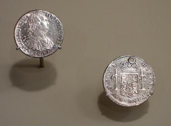 | Keywords: 8 reales, Spanish coins, King Charles IV, left 1807 from the Mexico City mint, right 1793 from the Potosi Mint in Bolivia, silver - Winterthur Museum - DSC01592.JPG en Exhibit in the Winterthur Museum New Castle County Delaware USA Photography was permitted in the museum without restriction This work is in the public domain because the artist died more than 70 years ago 2013-05-08 12 55 40 own Daderot cc-zero Real español 1807 Coins with a face value of 8 1807 Coins of Charles IV of Spain 1807 Metalwork in Winterthur Museum Mint of Potosí 1807 |