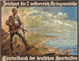 | Keywords: 8 Sammlung Eybl Österreich. Anonym. Zeichnet die 7. oesterreich. Kriegsanleihe. 1917. 74 x 95 cm. (Slg.Nr. 78).jpg  Österreich Anonym Zeichnet die 7 oesterreich Kriegsanleihe 1917 74 x 95 cm Slg Nr 78 Bis zum Jahr 1917 hatte die österreichisch-ungarische Armee 11 italienische Offensiven am Isonzo abgewehrt Der Soldat steht siegessicher und gelassen auf den Karstbergen vor Triest er stellt die Garantie dafür dar dass die wichtigste Hafenstadt der Monarchie nicht in die Hände des Feindes fallen werde Flugzeuge waren die damals modernsten Waffen “ in Verbindung mit dem unüberwindbaren Infanteristen ein Bild völliger Sicherheit Austria Anonymous Draws the 7 Austria War Loan 1917 74 x 95 cm Slg Nr 78 By the year 1917 the Austro-Hungarian army had blocked 11 Italian offensives on the Isonzo The soldier is confident of victory and left on the karst mountains before Trieste it represents the guarantee that the most important seaport of the monarchy will not fall into the hands of the enemy Airplanes were the most modern weapons - in conjunction with the insurmountable infantrymen an image of complete safety Sammlung Eybl Plakatmuseum Wien 2009-07-28 15 51 45 A Erhardt Credit line Eybl Plakatmuseum Wien/Wikimedia Commons CC-BY-SA-4 0 wiki Sammlung Eybl Plakatmuseum Wien PD-old-100-1923 World War I posters of Austria-Hungary War bonds Plakatmuseum Wien Eybl Collection Quality images by Hubertl QualityImage |
