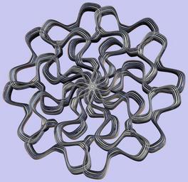| Keywords: mathematica 3d cg parametricplot3d texture torus code program algorithm プログラム コード アルゴリズム 輪環 りんかん ドーナツ どーなつ トーラス とーらす geometric sculpture geometricsculpture shape geometry sculpture mapping テクスチャ マッピング 模様 もよう abstract 抽象 ちゅうしょう アブストラクト design pattern デザイン パターン graphic グラフィック グラフィクス structure 意匠 構造 symmetry 対称性 たいしょうせい シンメトリー 対称 たいしょう tangle cartoon a = 10; (* center hole size of a torus *) b1 = 5;(* the number of angles *) b2 = 6;(* the number of waves *) c = 9; (* distance from the center of rotation *) d = 8; (* the number of tori *) h1 = 1; (* width of a torus *) h2 = 3; (* width of a torus *) SetOptions[ParametricPlot3D, PlotRange -> Full, Mesh -> None,    Boxed -> False, Axes -> None, PlotPoints -> 500, ImageSize -> 3000,    Background -> RGBColor[{200, 200, 240}/255],    PlotStyle -> Directive[Specularity[White, 70], Texture[Import["D:/tmp/94.jpg"]]],   TextureCoordinateFunction -> ({#4, #5 Pi} &), Lighting -> "Neutral"];  f[v_] := Sin[2 Sin[Sin[Sin[v]]]]; x = (a - h1 Cos[t] + h2 f[b1 s]) Cos[s] + c; y = (a - h1 Cos[t] + h2 f[b1 s]) Sin[s] + c; z = f[b2 t]; rm = Table[{x, y, z}.RotationMatrix[2 i Pi/d, {1, 0, 0}], {i, d}];  ParametricPlot3D[rm, {t, 0, 2 Pi}, {s, 0, 2 Pi}]  (*---  The Texture *)   a = 10; (* center hole size of a torus *) b1 = 5;(* the number of angles *) b2 = 6;(* the number of waves *) c = 9; (* distance from the center of rotation *) d = 8; (* the number of tori *) h1 = 1; (* width of a torus *) h2 = 3; (* width of a torus *) SetOptions[ParametricPlot3D, PlotRange -> Full, Mesh -> None,    Boxed -> False, Axes -> None, PlotPoints -> 500, ImageSize -> 3000,    Background -> RGBColor[{200, 200, 240}/255],    PlotStyle -> Directive[Specularity[White, 70], Texture[Import["D:/tmp/94.jpg"]]],   TextureCoordinateFunction -> ({#4, #5 Pi} &), Lighting -> "Neutral"];  f[v_] := Sin[2 Sin[Sin[Sin[v]]]]; x = (a - h1 Cos[t] + h2 f[b1 s]) Cos[s] + c; y = (a - h1 Cos[t] + h2 f[b1 s]) Sin[s] + c; z = f[b2 t]; rm = Table[{x, y, z}.RotationMatrix[2 i Pi/d, {1, 0, 0}], {i, d}];  ParametricPlot3D[rm, {t, 0, 2 Pi}, {s, 0, 2 Pi}]  (*---  The Texture *)    |