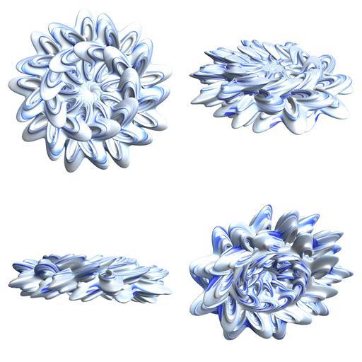 Keywords: mathematica 3d cg parametricplot3d texture torus 輪環 りんかん ドーナツ どーなつ 六芒星 ろくぼうせい 六光星 六稜星 ろくこうせい ろくりょうせい program プログラム code コード algorithm コード アルゴリズム hexagram geometric sculpture geometricsculpture shape geometry sculpture mapping テクスチャ マッピング 模様 もよう design pattern デザイン パターン graphic グラフィック グラフィクス structure 意匠 構造 symmetry 対称性 たいしょうせい シンメトリー 対称 たいしょう algorithm white background plant blossom SetOptions[ParametricPlot3D, PlotRange -> Full, Mesh -> None, Boxed -> False, Axes -> None, PlotPoints -> 400, ImageSize -> 1000, PlotStyle -> Directive[Specularity[White, 30], Texture[Import["D:/tmp/863.jpg"]]], TextureCoordinateFunction -> ({#4 + #5, #5/Pi} &), Lighting -> "Neutral"]; a = 2; (* center hole size of a torus *) b = 6; (* hexa-torus *) c = 4; (* distance from the center of rotation *) d = 9; (* number of torus *) g[v_] := Sum[Cos[(2 k - 1) v]/(2 k - 1), {k, 4}]; x = (a - g[t] - Sin[b s]) Cos[s + Pi/(2 b)] + c; y = Sin[t] + c; z = (a - g[t] - Sin[b s]) Sin[s + Pi/(2 b)] + c; rot = Table[{x, y, z}.RotationMatrix[2 i Pi/d, {Pi/b, 1, 0}], {i, d}]; ParametricPlot3D[rot, {t, 0, 2 Pi}, {s, 0, 2 Pi}] (*--- The Texture The g[] is a 4-partial sum of the Fourier series for Square wave. g[]は矩形波のフーリエ展開の最初の4項 *) SetOptions[ParametricPlot3D, PlotRange -> Full, Mesh -> None, Boxed -> False, Axes -> None, PlotPoints -> 400, ImageSize -> 1000, PlotStyle -> Directive[Specularity[White, 30], Texture[Import["D:/tmp/863.jpg"]]], TextureCoordinateFunction -> ({#4 + #5, #5/Pi} &), Lighting -> "Neutral"]; a = 2; (* center hole size of a torus *) b = 6; (* hexa-torus *) c = 4; (* distance from the center of rotation *) d = 9; (* number of torus *) g[v_] := Sum[Cos[(2 k - 1) v]/(2 k - 1), {k, 4}]; x = (a - g[t] - Sin[b s]) Cos[s + Pi/(2 b)] + c; y = Sin[t] + c; z = (a - g[t] - Sin[b s]) Sin[s + Pi/(2 b)] + c; rot = Table[{x, y, z}.RotationMatrix[2 i Pi/d, {Pi/b, 1, 0}], {i, d}]; ParametricPlot3D[rot, {t, 0, 2 Pi}, {s, 0, 2 Pi}] (*--- The Texture The g[] is a 4-partial sum of the Fourier series for Square wave. g[]は矩形波のフーリエ展開の最初の4項 *) |