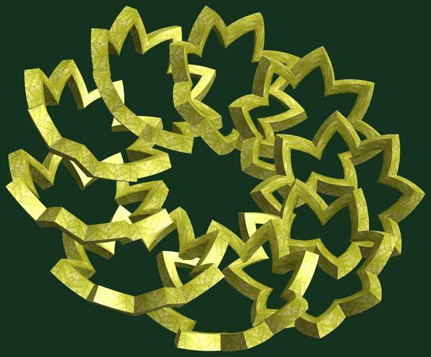 | Keywords: mathematica 3d cg parametricplot3d texture torus code program algorithm プログラム コード アルゴリズム 輪環 りんかん ドーナツ どーなつ 八芒星 はちぼうせい geometric sculpture geometricsculpture shape geometry sculpture mapping テクスチャ マッピング 模様 もよう abstract 抽象 ちゅうしょう アブストラクト design pattern デザイン パターン graphic グラフィック グラフィクス structure 意匠 構造 symmetry 対称性 たいしょうせい シンメトリー 対称 たいしょう organic pattern black background a = 6; (* center hole size *) b = 8; (* octa-torus *) c = 10; (* distance from the center of rotation *) d = 9; (* number of torus *) h = 1; (* height of a torus *) SetOptions[ParametricPlot3D, PlotRange -> Full, Mesh -> None, Boxed -> False, Axes -> False, PlotPoints -> 400, ImageSize -> 3000, Background -> RGBColor[{20, 50, 30}/255], PlotStyle -> Directive[Specularity[White, 30], Texture[Import["D:/tmp/71.jpg"]]], TextureCoordinateFunction -> ({#4, #5 Pi} &), Lighting -> "Neutral"]; f[v_] := TriangleWave[{-1, 1}, v/(2 Pi)]; g[v_] := TriangleWave[{-1, 1}, v/(2 Pi) + 1/4]; x = (a - g[t] - f[b s]) Cos[s] + c; y = (a - g[t] - f[b s]) Sin[s] + c; z = (a - f[t] - h f[b s]); rm = Table[{x, y, z}.RotationMatrix[2 i Pi/d, {0, 1, 2}], {i, d}]; ParametricPlot3D[rm, {t, 0, 2 Pi}, {s, 0, Pi}] (*--- The Texture *) a = 6; (* center hole size *) b = 8; (* octa-torus *) c = 10; (* distance from the center of rotation *) d = 9; (* number of torus *) h = 1; (* height of a torus *) SetOptions[ParametricPlot3D, PlotRange -> Full, Mesh -> None, Boxed -> False, Axes -> False, PlotPoints -> 400, ImageSize -> 3000, Background -> RGBColor[{20, 50, 30}/255], PlotStyle -> Directive[Specularity[White, 30], Texture[Import["D:/tmp/71.jpg"]]], TextureCoordinateFunction -> ({#4, #5 Pi} &), Lighting -> "Neutral"]; f[v_] := TriangleWave[{-1, 1}, v/(2 Pi)]; g[v_] := TriangleWave[{-1, 1}, v/(2 Pi) + 1/4]; x = (a - g[t] - f[b s]) Cos[s] + c; y = (a - g[t] - f[b s]) Sin[s] + c; z = (a - f[t] - h f[b s]); rm = Table[{x, y, z}.RotationMatrix[2 i Pi/d, {0, 1, 2}], {i, d}]; ParametricPlot3D[rm, {t, 0, 2 Pi}, {s, 0, Pi}] (*--- The Texture *) |